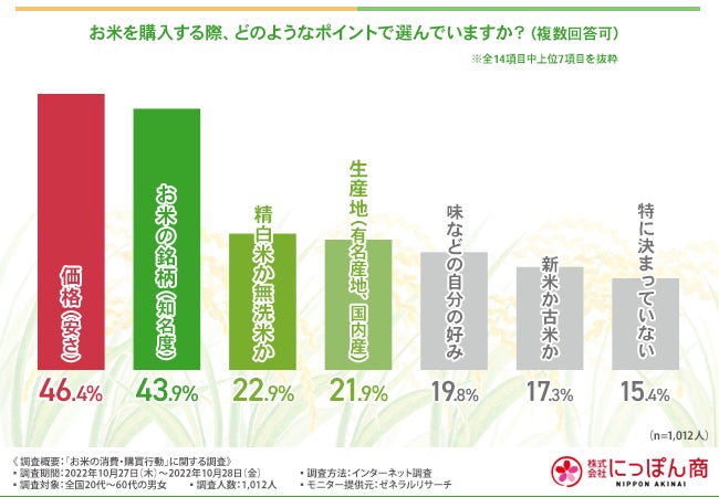 「お⽶を購⼊する際、どのようなポイントで選んでいますか?(複数回答可)」と質問したところ、『価格(安さ)(4 6.4%)』と回答した⽅が最も多く、次いで『お⽶の銘柄(知名度)(43.9%)』『精⽩⽶か無洗⽶か(22.9%)』『⽣産地(有名産地、国内産)(21.9%)』と続きました。