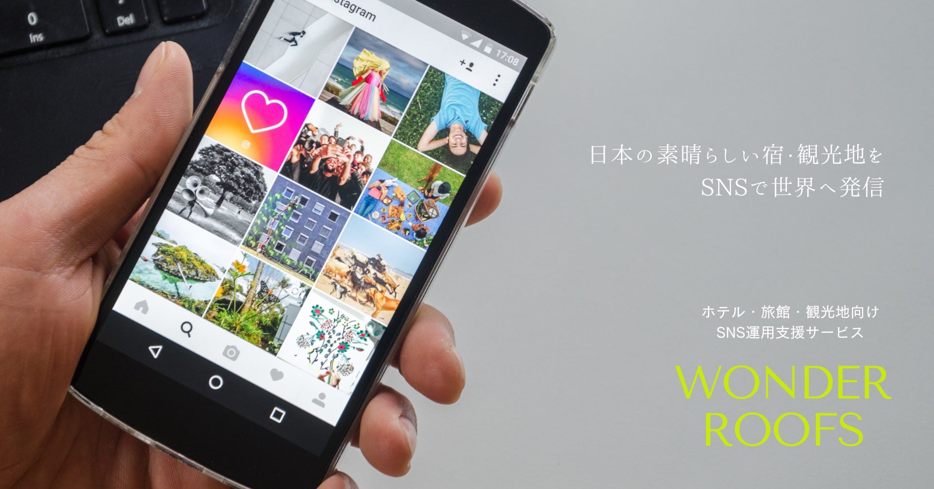 「日本の素晴らしい宿・観光地をSNSで世界へ発信」がコンセプトのWONDER ROOFSは、ホテル・旅館向けデジタルソリューションを提供する総合コンサルティングサービスです。Instagram運用をはじめ、SNSでの認知拡大や集客、自社ホームページによる販売促進、マーケティングおよびブランディング施策実施をトータルサポートし、宿泊業のDXを支援します。