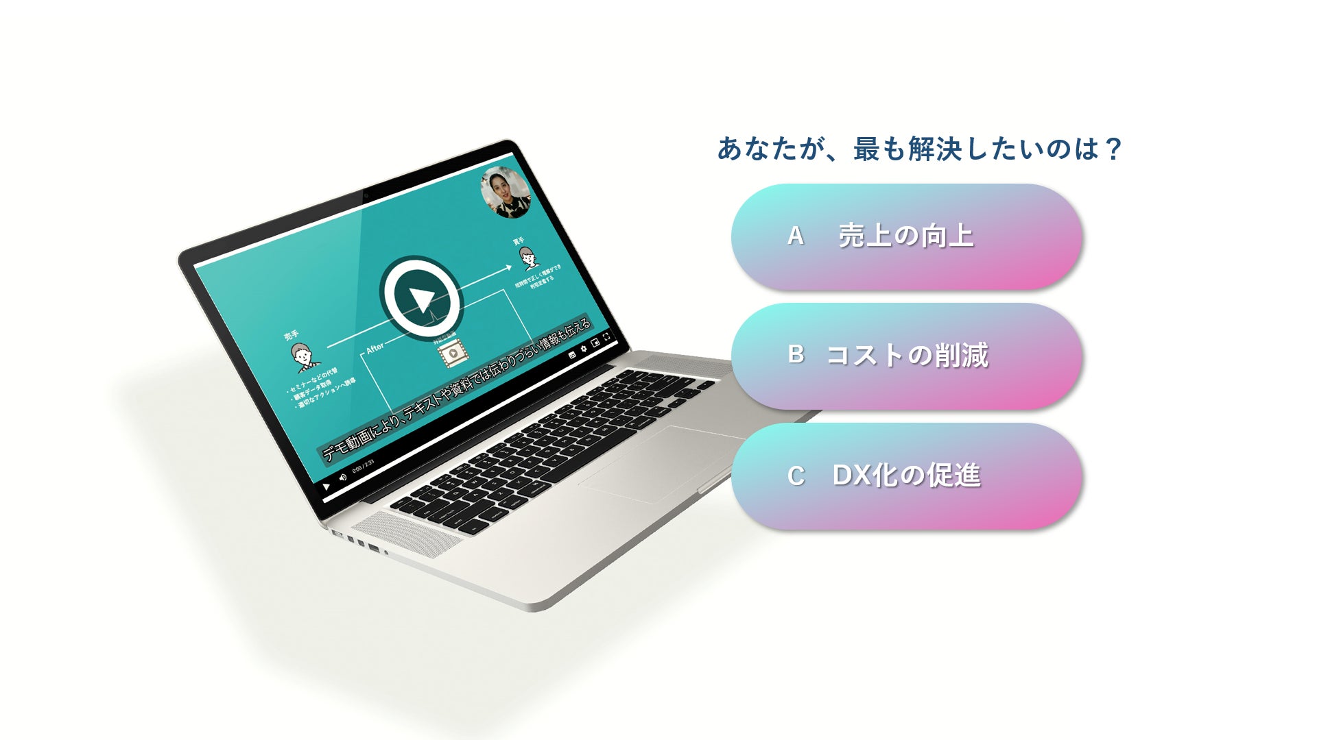 動画内に「設問」を表示することができ、その回答結果に応じて相手に見せる動画を自動的に変更することができます。(例:役職者別、職種別、企業規模別、購買確度別)加えて、動画内で相手に合わせた“適切な営業担当者”との商談日程調整などに促すことも可能です。