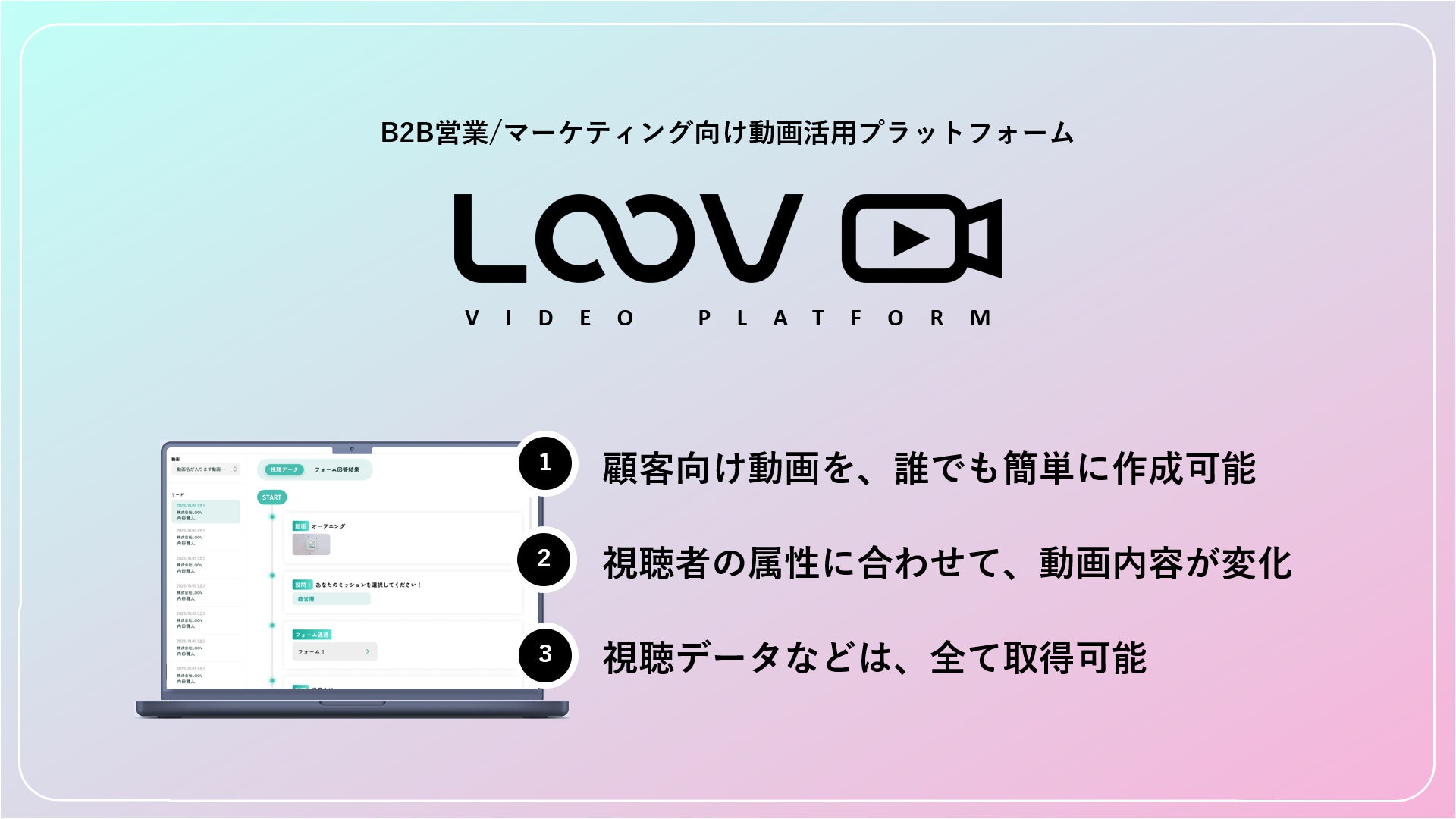 今回は、2022年9月にα版の提供を開始した、営業・マーケティング向け動画(インタラクティブ動画)活用プラットフォーム「LOOV」(https://loov-video.com/lp)の本リリースに向けた事業展開を加速し、更なるプロダクトの強化を図ることを目的としております。LOOVは、BtoBにおける買手と売手のコミュニケーションを抜本的に変革することを目指しており、既に数十社の企業様に「LOOV α版」の導入をいただいております。
