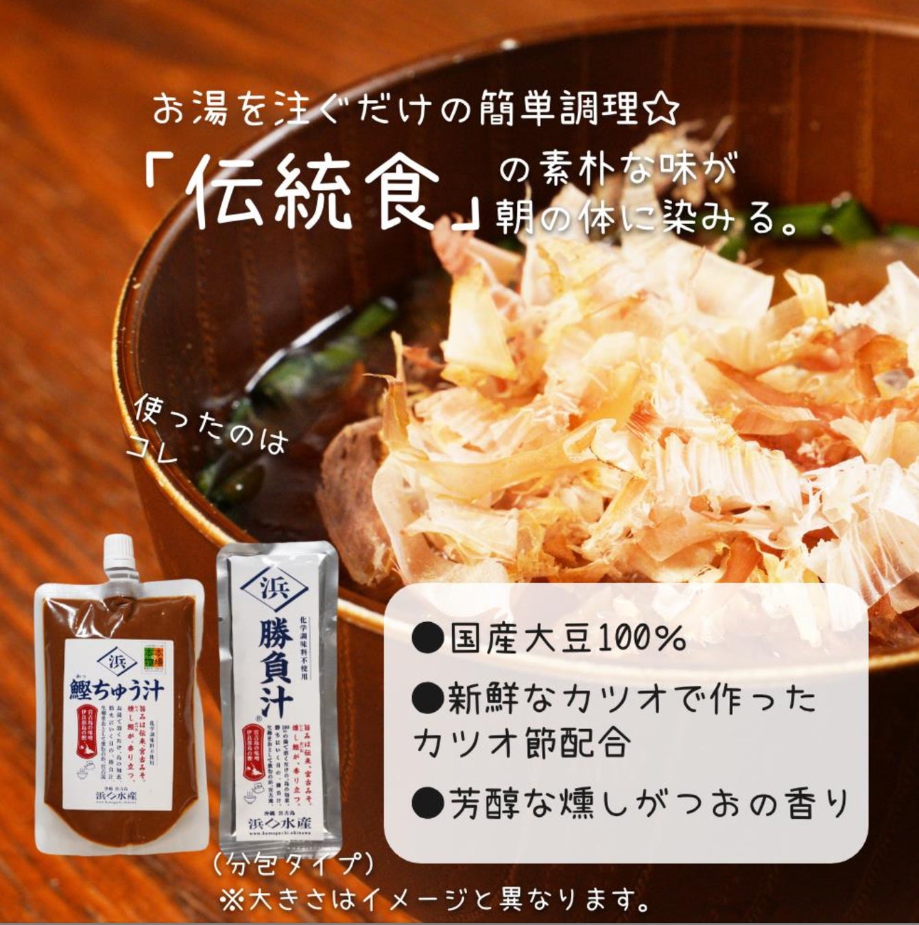 宮古のかつおだしを使用した天ぷら粉は、水と粉を混ぜるだけ。どなたでも簡単にふわっと美味しい天ぷらが完成します。そして、新鮮なカツオで作った鰹節配合の「勝負汁」は、宮古島のソールフードとして、ここ一番の時に飲まれてきた味噌汁です。分包タイプもセットに入っているので、オフィスや出張、スポーツ観戦の時にも便利です。