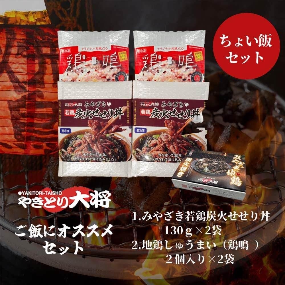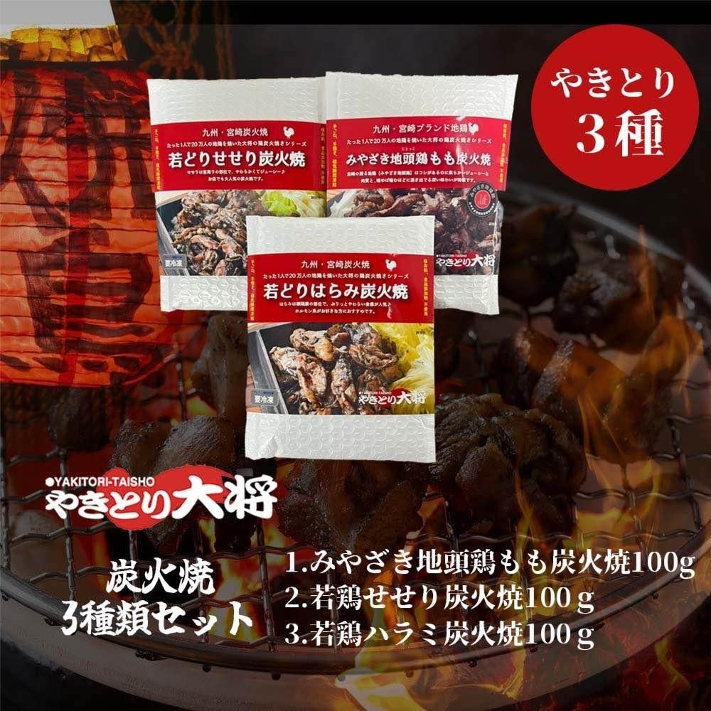 宮崎県の銘柄ブランド「みやざき地鶏頭」を使用した焼き鳥、しゅうまいセットです。この道30年以上の大将が、炎舞う炭火で丁寧に焼き上げています。今回は3つのセットをご用意しました。