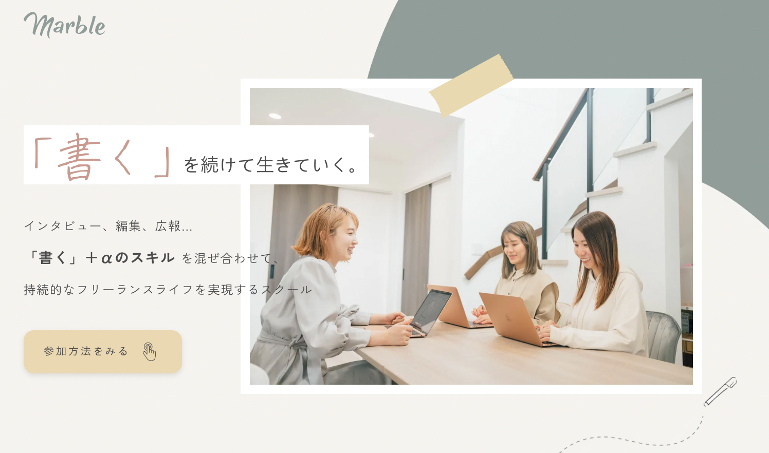「書く」+αのスキルを身につけて、持続的なフリーランスライフを実現するスクールです。インタビュー、編集、広報、フリーランススキルを学ぶオンライン講座、キャリア面談、コミュニティ活動により実践的に学びます。(URL:https://marble-school.studio.site/)