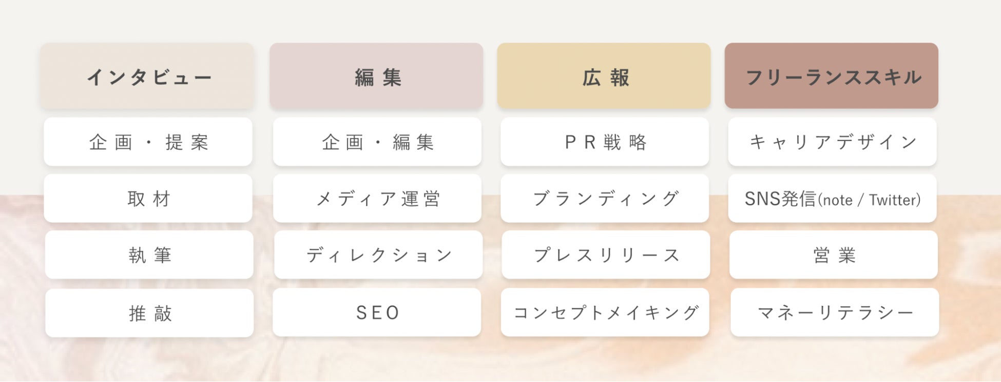 そこで、基本的なライティングスキルに加えて、インタビュー、編集、広報のスキルを新たに身に着けることで、より豊かで持続的なキャリアを描くスクールを考案しました。