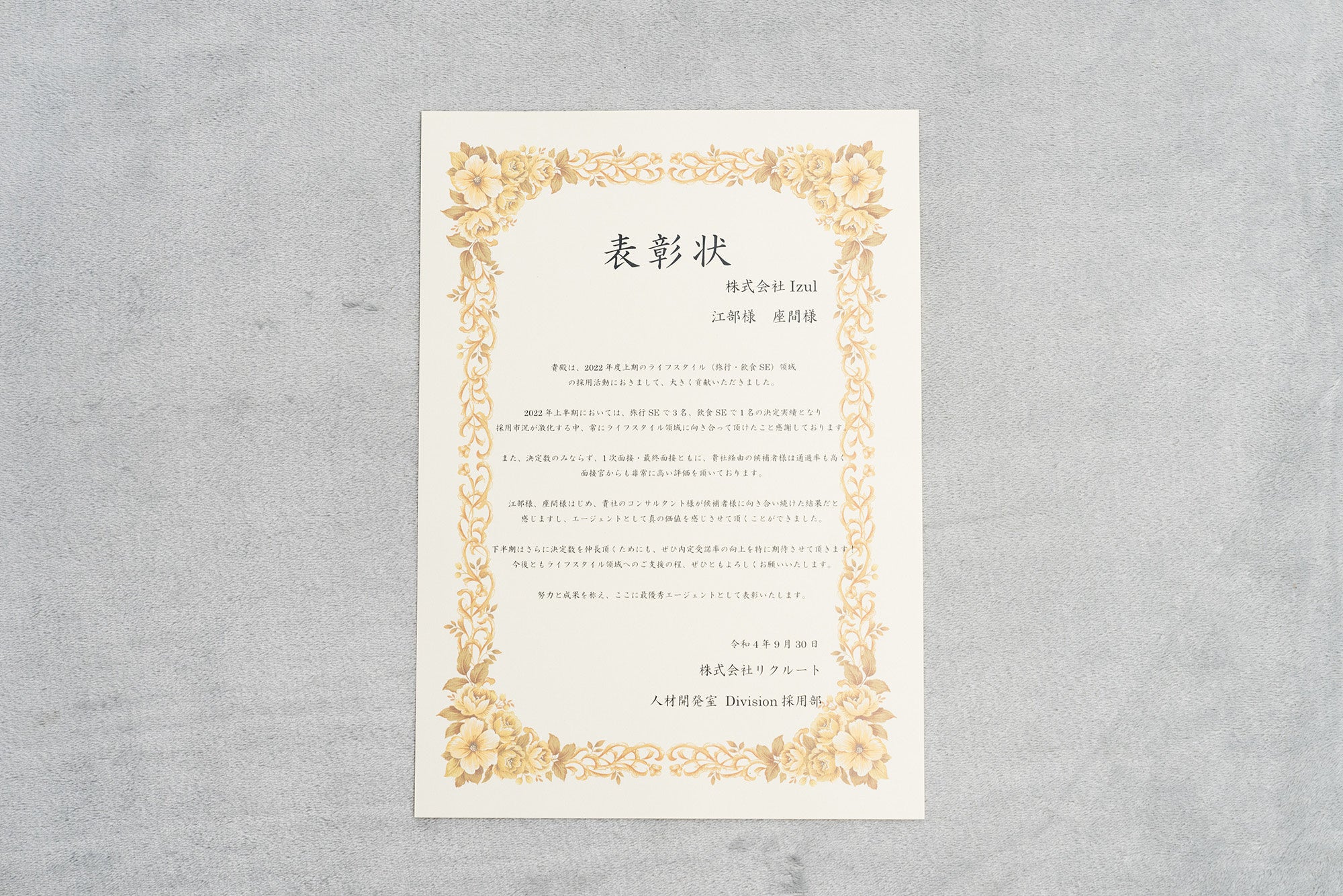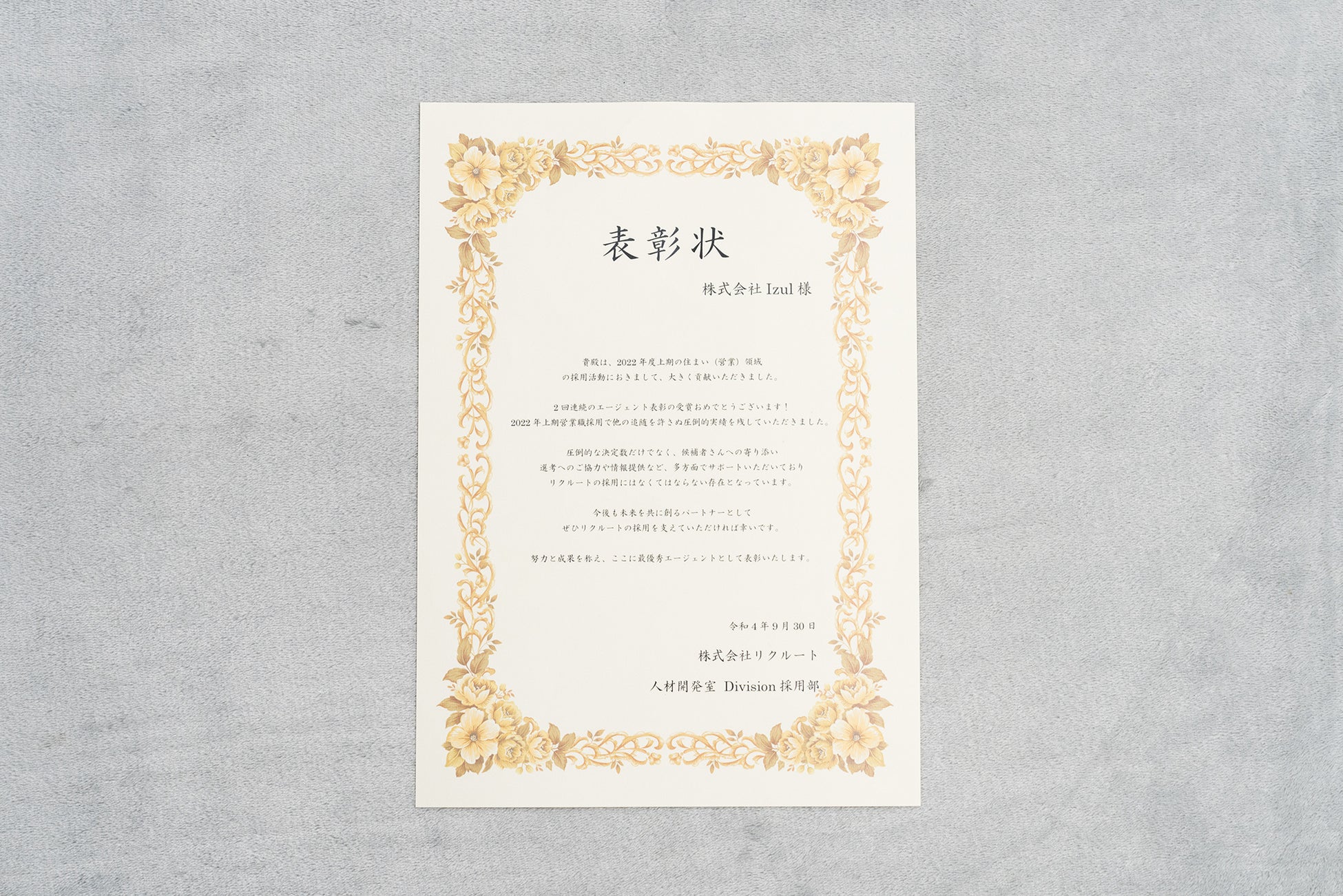 若手ハイクラス向け転職エージェントの株式会社Izul(本社:東京都港区、代表取締役:中田潤一 以下、Izul)は、この度株式会社リクルート様の2022年度上期の「住まい領域」「リクルートライフスタイル(旅行・飲食領域)」の2領域での中途採用における「最優秀エージェント賞」を受賞いたしましたことをお知らせします。