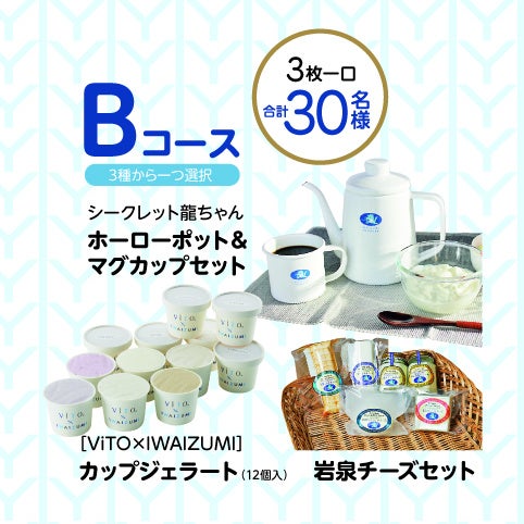 Bコース「ホーローポット&マグカップセット」10名様、「ViTO×IWAIZUMIカップジェラート12個入」10名様、「岩泉チーズセット」10名様、合計30名