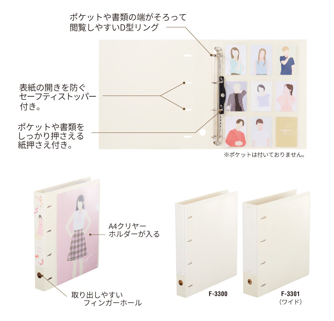 コレクションポケット各種(別売)と組み合わせることで、推し活グッズをまとめて保管できる4穴のD型リングファイルです。表紙にはA4のポスターやクリヤーホルダーが入るポケット付きで、オリジナル表紙を作ることができます。A4クリヤーホルダーの収容に対応するため、通常のD型リングファイルと比べて本体の高さが11mm大きい設計です。ラベリングやデコレーションがしやすいシンプルデザインの背見出し紙やファイルのゆがみを防ぐセーフティストッパー、収納物の垂れを防ぐ樹脂製紙押さえを付属しています。