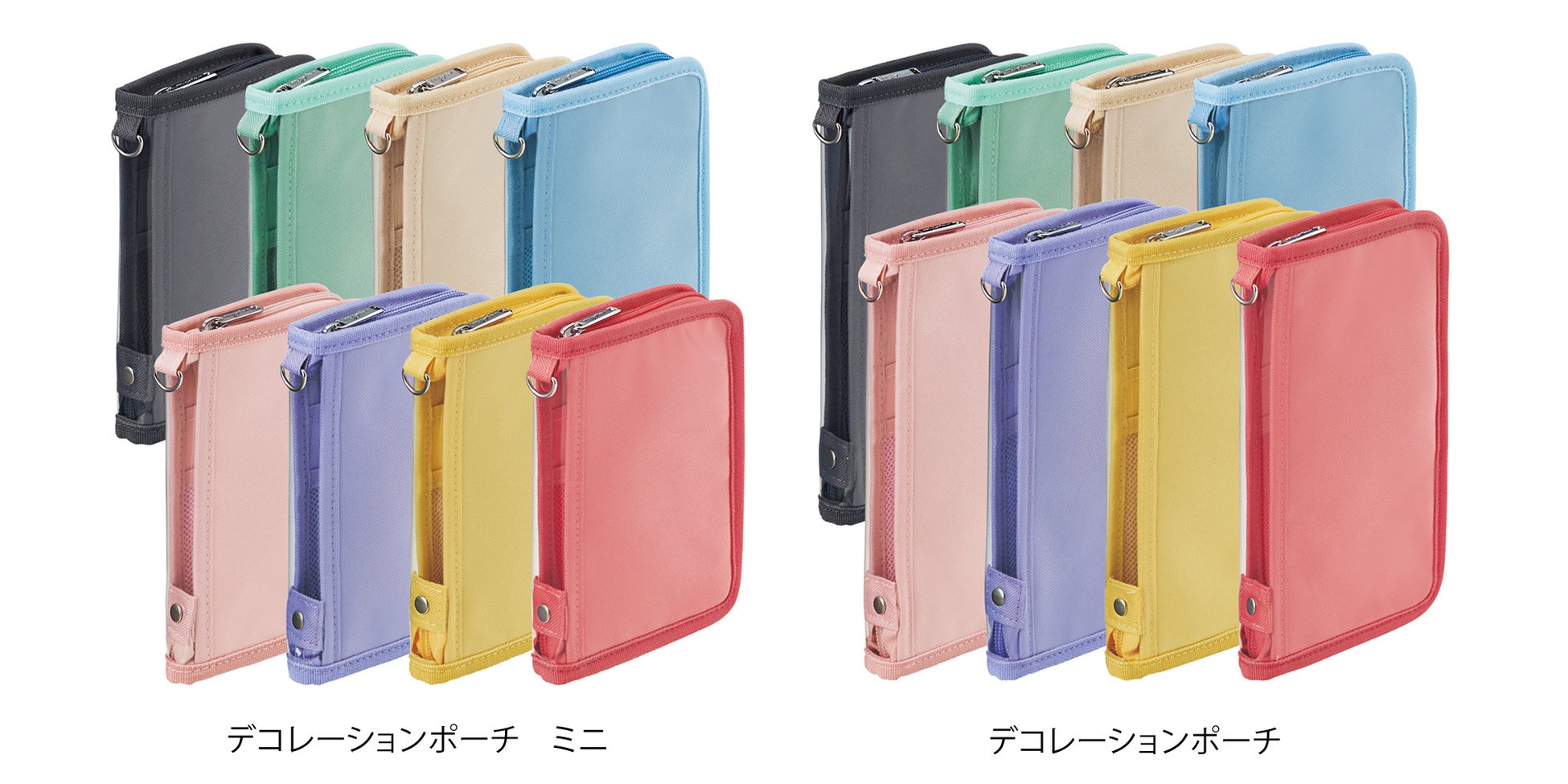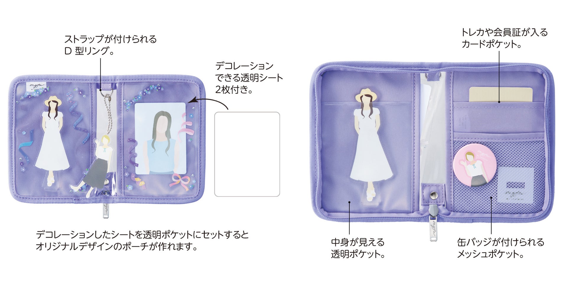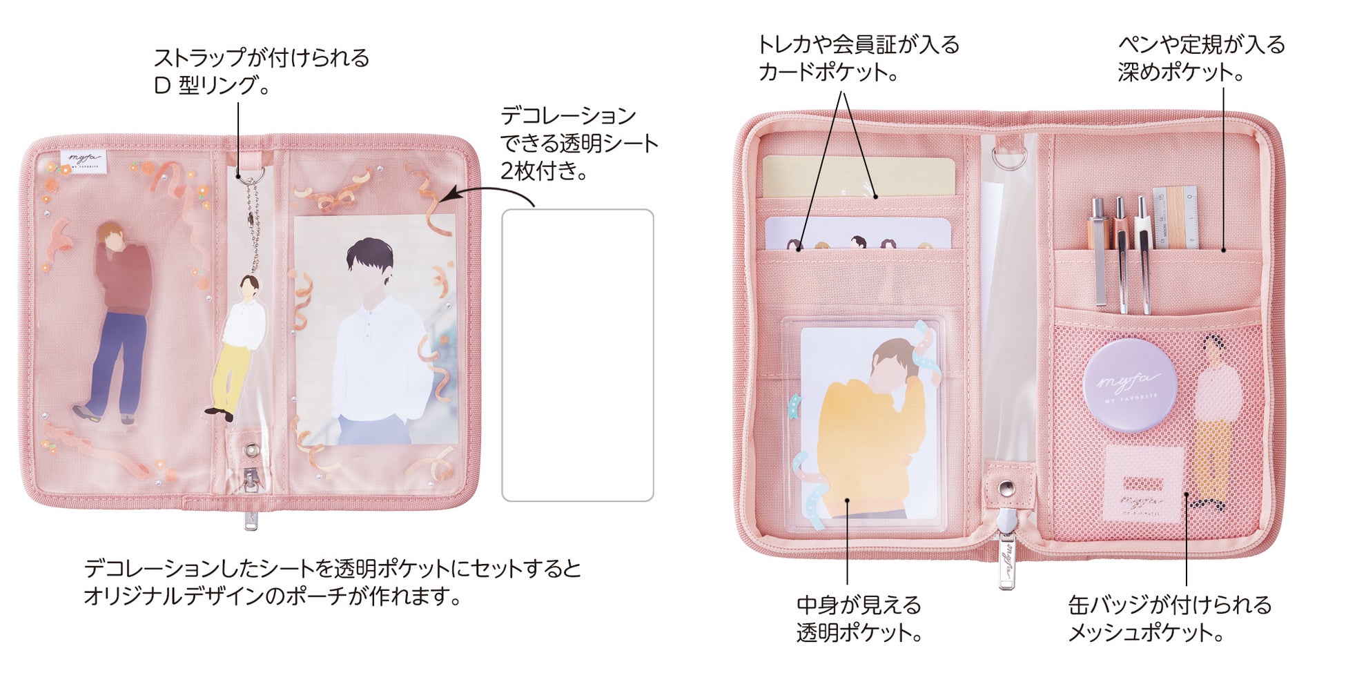 推し活グッズの持ち運びに便利な見開き式ポーチです。ミニサイズとスタンダードサイズの2サイズで展開いたします。外側の透明ポケットに付属の透明シートをデコレーションして挿入することで、自分だけのポーチを作ることができます。ミニサイズはカードポーチや文具小物の収納・パスポーチとして、スタンダードサイズはペンケースやトラベルポーチ・通帳ケースとしても活用いただけます。