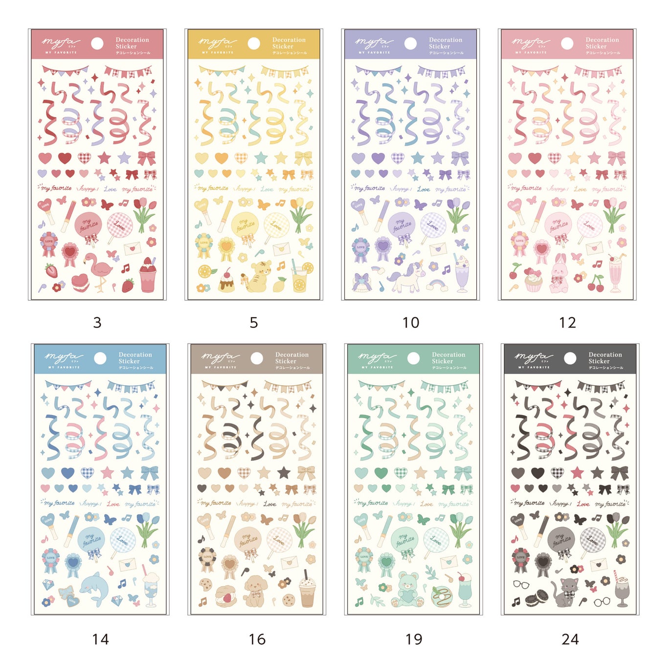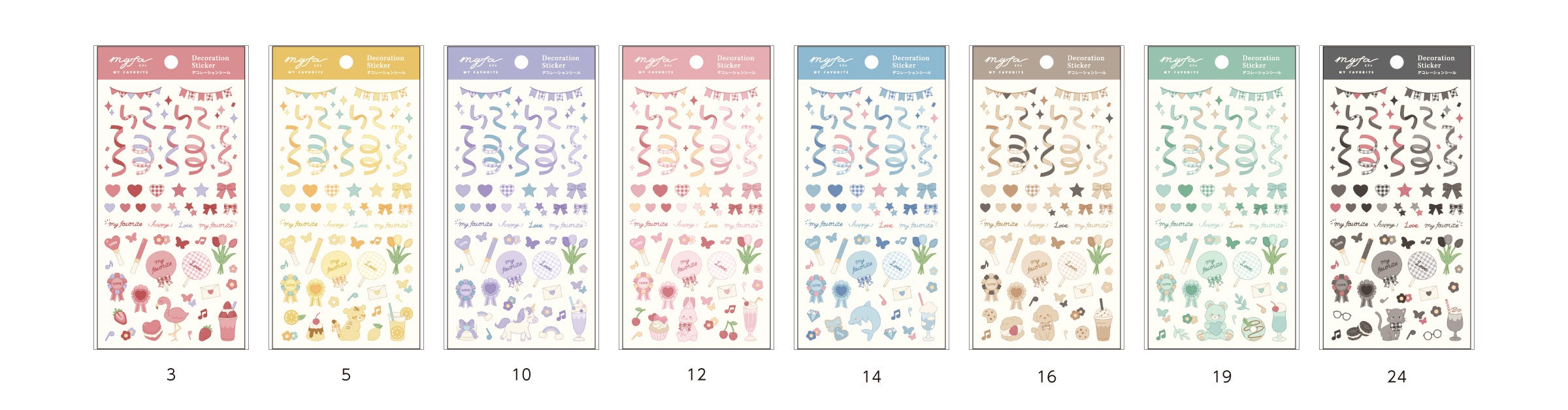 デコレーションに使いやすいガーランドやリボン等のモチーフの他、推し活に関連したうちわやサイリウム、カラーに合わせた動物のデザインなどasuka氏のこだわりが詰まった書下ろしデザインのデコレーションシールです。トレーディングカードや写真、デコレーションポーチ付属の透明シートのデコレーションに使用できます。メンバーカラーなどの推し色に合わせて選べる8色で展開いたします。
