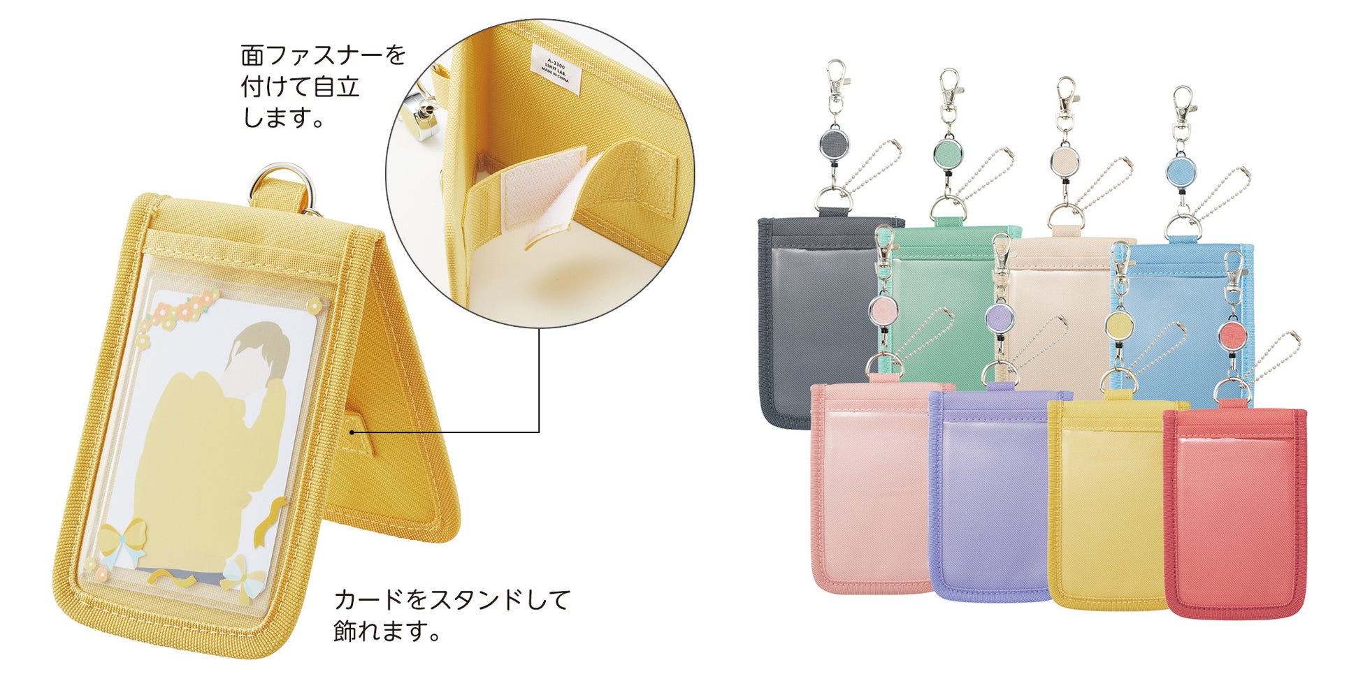 トレーディングカードやミニ写真を立てて飾れるケースです。本体内側の面ファスナーを使うと自立します。おもて面のPVCポケットは、トレーディングカードを硬質カードケース(B8サイズ)に入れたまま収納できるサイズ設計です。伸縮リールとボールチェーンが付属しているため、バッグに取り付けてカフェやコンサート会場にも持ち運びにもぴったりです。ICカードを収納できる背面ポケット付きで、パスケースとしても使用できます。