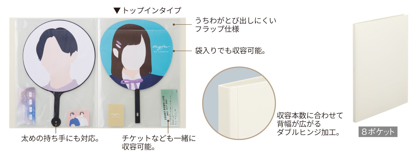 うちわの収納にぴったりなポケット固定式のクリヤーブックです。ジャンボうちわを想定したポケットサイズで、同じポケット内にチケットなども合わせて収納できるので、ライブごとにうちわとチケットを整理することができます。うちわの型が余裕のあるサイズ設計のため、持ち手が太いタイプのうちわや、購入時にうちわ本体が入っている袋のままでも収容可能です。ポケット上部はフラップ仕様で、うちわのとび出しを防ぎます。