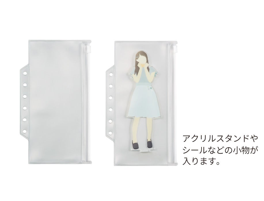 推し活グッズの持ち運びに便利なミニ6穴リング付きバインダーです。付属のファスナーポケットや本体ポケットに大きめのアクリルスタンドや缶バッジ、写真(L版)、チケットなどの推し活グッズを収納できます。別売のリフィル(N-3321)で、ポケットを追加することができます。