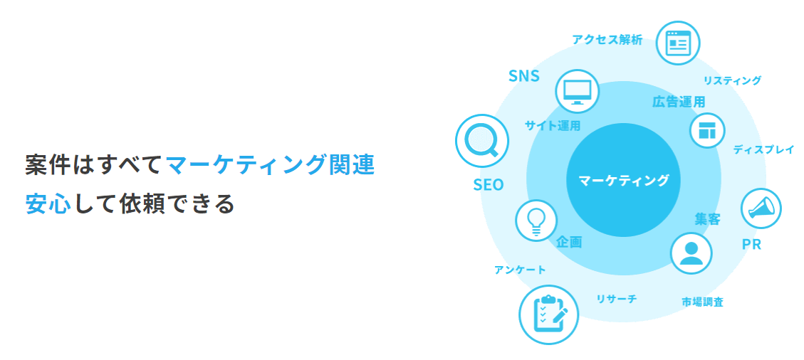 現在(2023年1月時点)対応可能なジャンルとしては、ブランディング/企画/SEO/データ分析/Web広告/SNS運用/PR動画制作となります。