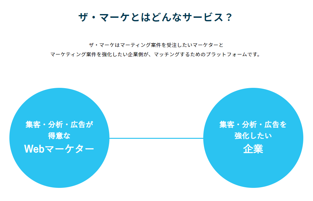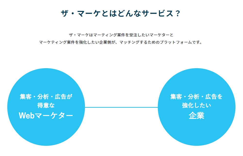 THE MARKE(https://the-marke.com/)はプロのマーケターチームにマーケティング業務を依頼できるプラットフォームサービスです。マーケティングに特化した様々なスキルを持ったマーケターが当サイトに登録しているため、ご依頼内容にあった最適なメンバーを構成して業務をお受けすることが可能です。