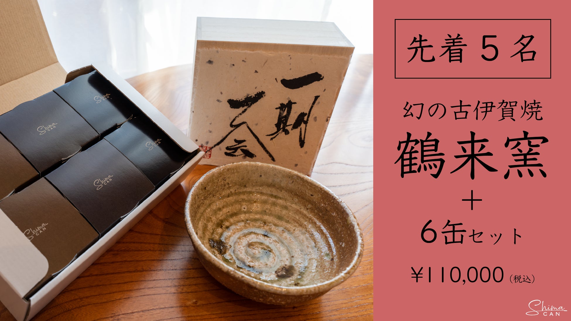 安土・桃山時代にわずか20数年しか焼かれていないことから“幻の焼き物”と言われる古伊賀焼を再現する、淡路島の「鶴来窯(かくらいがま)」。同窯が作る全て一点ものの器とShimaCan 6缶の特別なセットです。