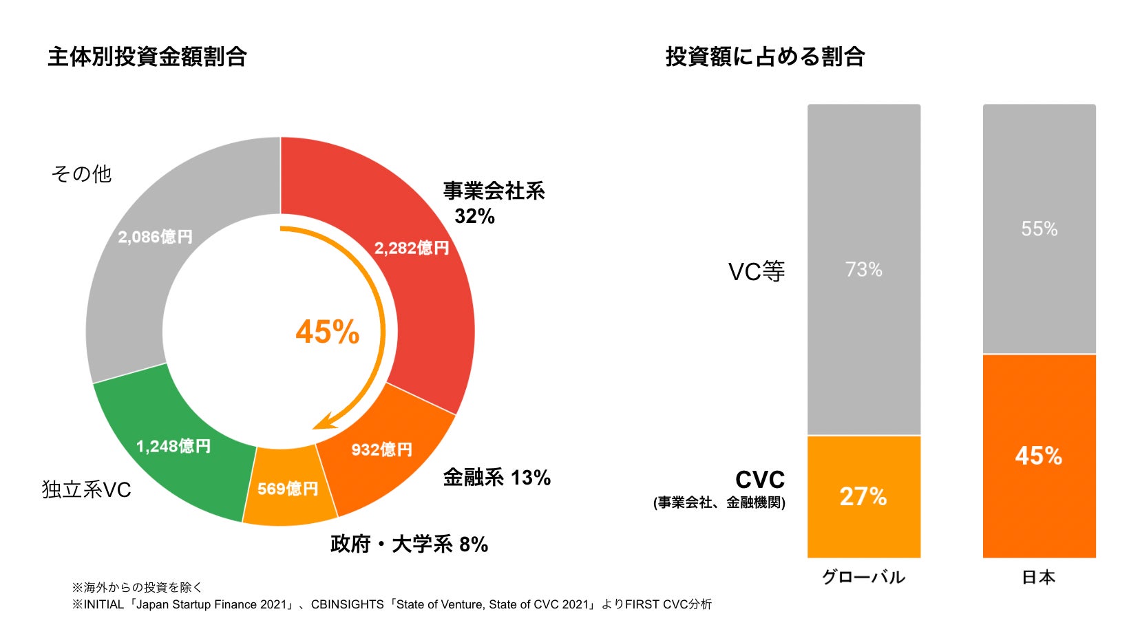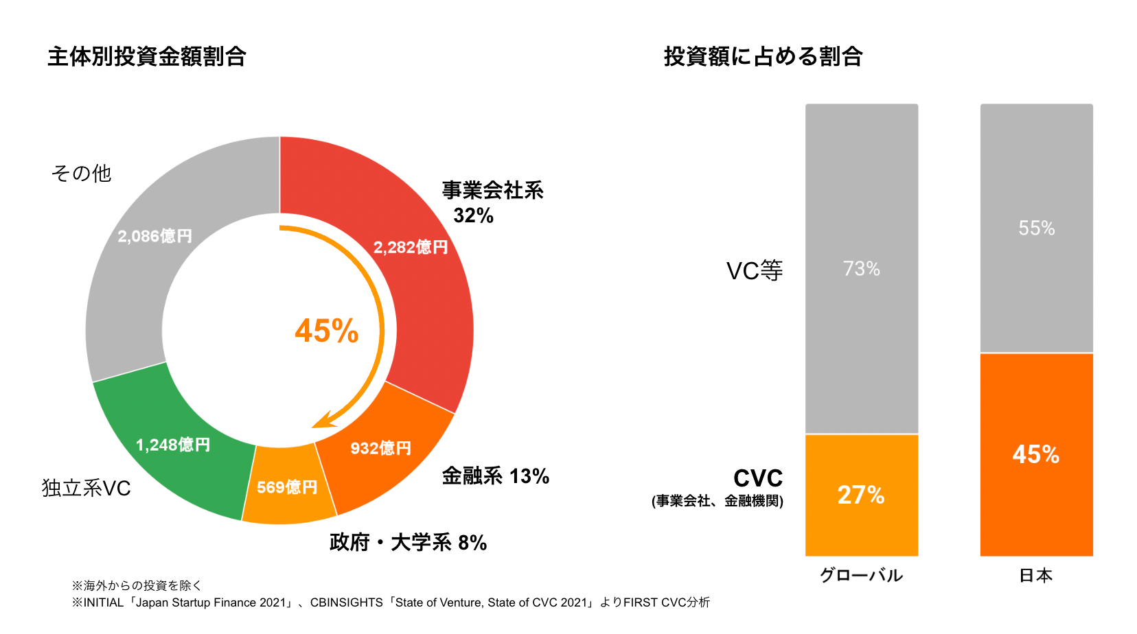 ※図表および文中の数値はINITIAL「Japan Startup Finance 2021」、CBINSIGHTS「State of Venture, State of CVC 2021」よりFIRST CVC分析