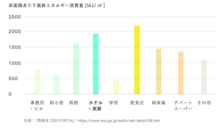 建物用途別のエネルギー消費量において、ホテルは床面積あたりの電力使用量が飲食店に次いで2番目に高くなっており、ホテルの電力使用量を実質0にすることは、脱炭素社会を加速させる大きな可能性を秘めています。ゼロエネルギーホテルが増えることで、自然環境に負荷をかけることなく人の楽しみを創り出す、これからの時代の持続可能な観光及び宿泊体験を多くの人に届けることができるようになります。