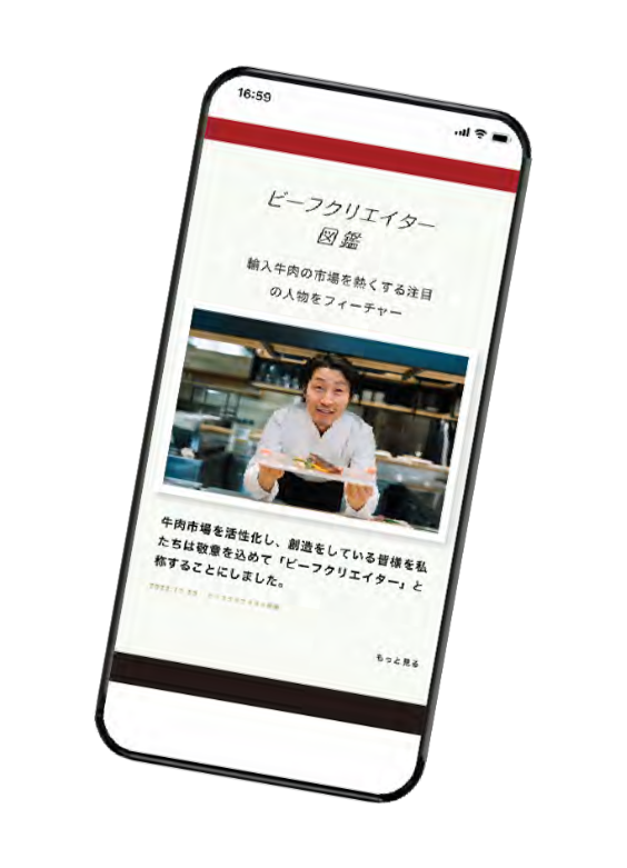 「和牛=高級肉、輸入牛肉=低価格肉」この心理的な図式はエイジングビーフ技術への評価や、高級ニューヨークステーキの出店ブームで、消費者の輸入牛肉へのイメージを良い意味で崩すことができました。これは自然発生で成り立ったわけではなく、熱心にブランディングを仕掛け、懸命に実行した功労者の成果です。当企画では牛肉の価値を高めるためにブランディングを仕掛けている外食産業、流通産業の各業種業態の企業や人物(=ビーフクリエイター)を取材し、その考え方を業界内の方々へ共有することで、牛肉の価値向上の底上げを図るドキュメンタリーを発信していきます。