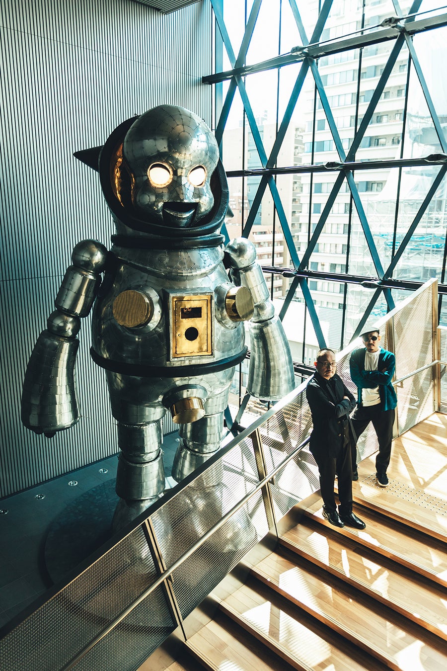 今回、ヤノベケンジの作品世界をイメージして、三木道三(DOZAN11)がストーリーを書き下ろし、ヤノベが絵を描いたのが 「SPACE SHIP’S CAT Zitto & Gatito」です。《SHIP’S CAT》は、潜水服や宇宙服をイメージしたヘルメットやスーツを装着し、深海や宇宙へ旅をするこれからの時代の若者の旅をイメージしていました。三木道三(DOZAN11)は、そこから着想し、宇宙船の船乗り猫と少年がバディとなって冒険の旅に乗り出し、宇宙人達と出会う物語になっています。それは異文化との出会いや交流、融和をも示唆しています。