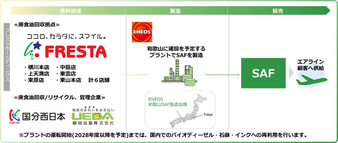 具体的な事業内容としては、広島市内で、現在捨てられている家庭系廃食油をフレスタの広島市内6店舗で回収し、国分西日本の物流網を活用し納品トラックの戻り荷として廃食油を集荷いたします。集荷された廃食油は国分西日本の倉庫に保管後、植田油脂が引取りを行い、将来的には、集めた廃食油を原料としてENEOSがSAFを製造し、空港に供給するまでのサプライチェーン構築を目指しております。なお、ENEOSのプラントが稼働するまでは、植田油脂にてバイオディーゼルや石鹸の原料として活用いたします。
