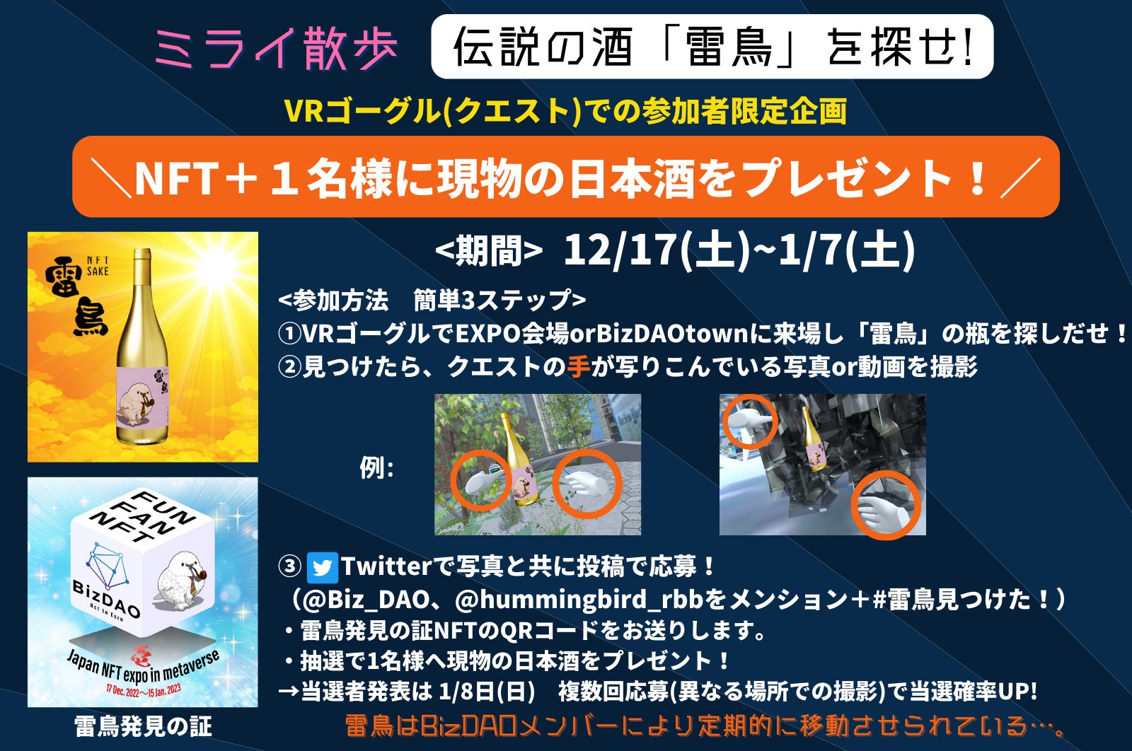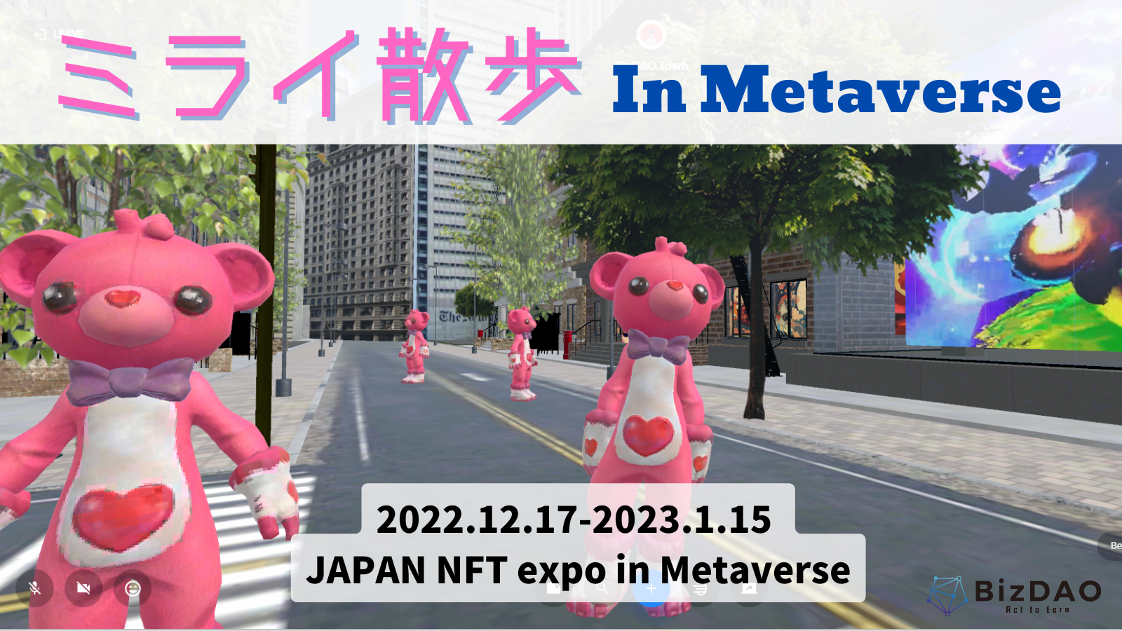 2022年12月17日(土)~2023年1月15日(日)まで行われている「Japan NFT expo in メタバース」において、一般社団法人One's placeは本EXPOを主催するDAO(分散型自律組織)・「BizDAO」の一員として、新しい技術を活用したイベント、「ミライ散歩 in Metaverse」を企画しました。