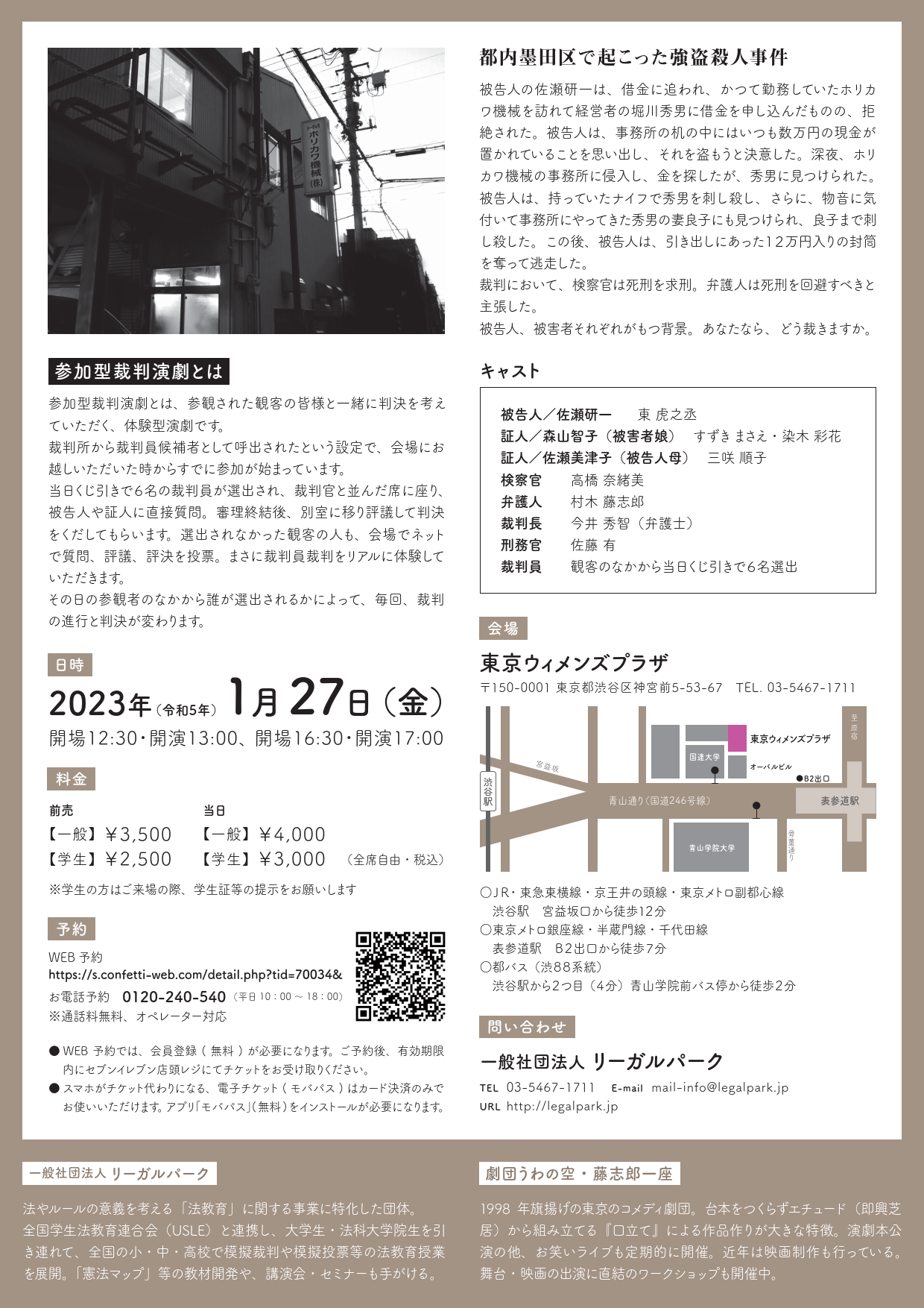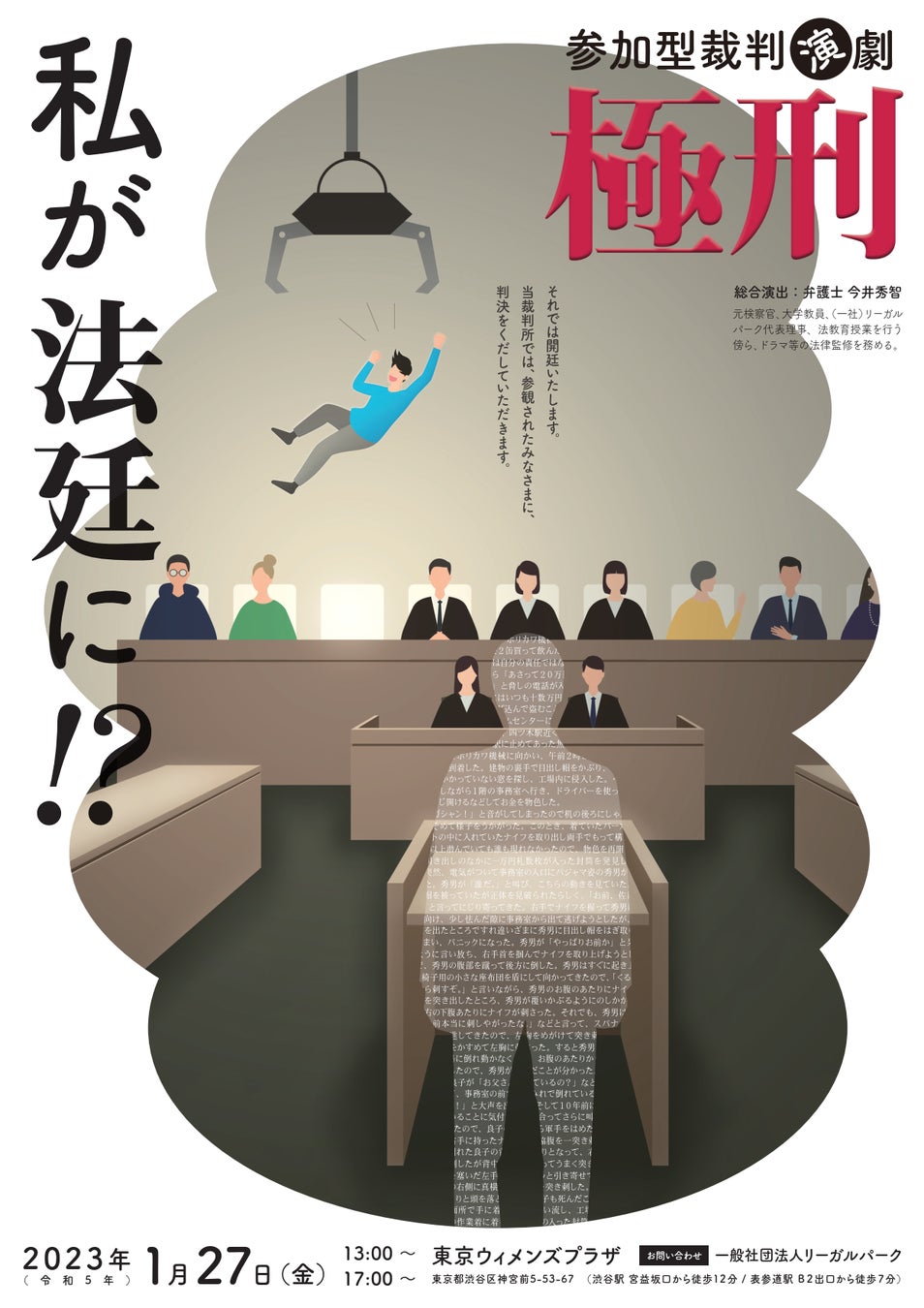 一般社団法人リーガルパークが劇団うわの空・藤志郎一座とコラボし、参加型裁判演劇「極刑」を2023年1月27日(金)に東京ウィメンズプラザ(東京渋谷区)にて開催します。