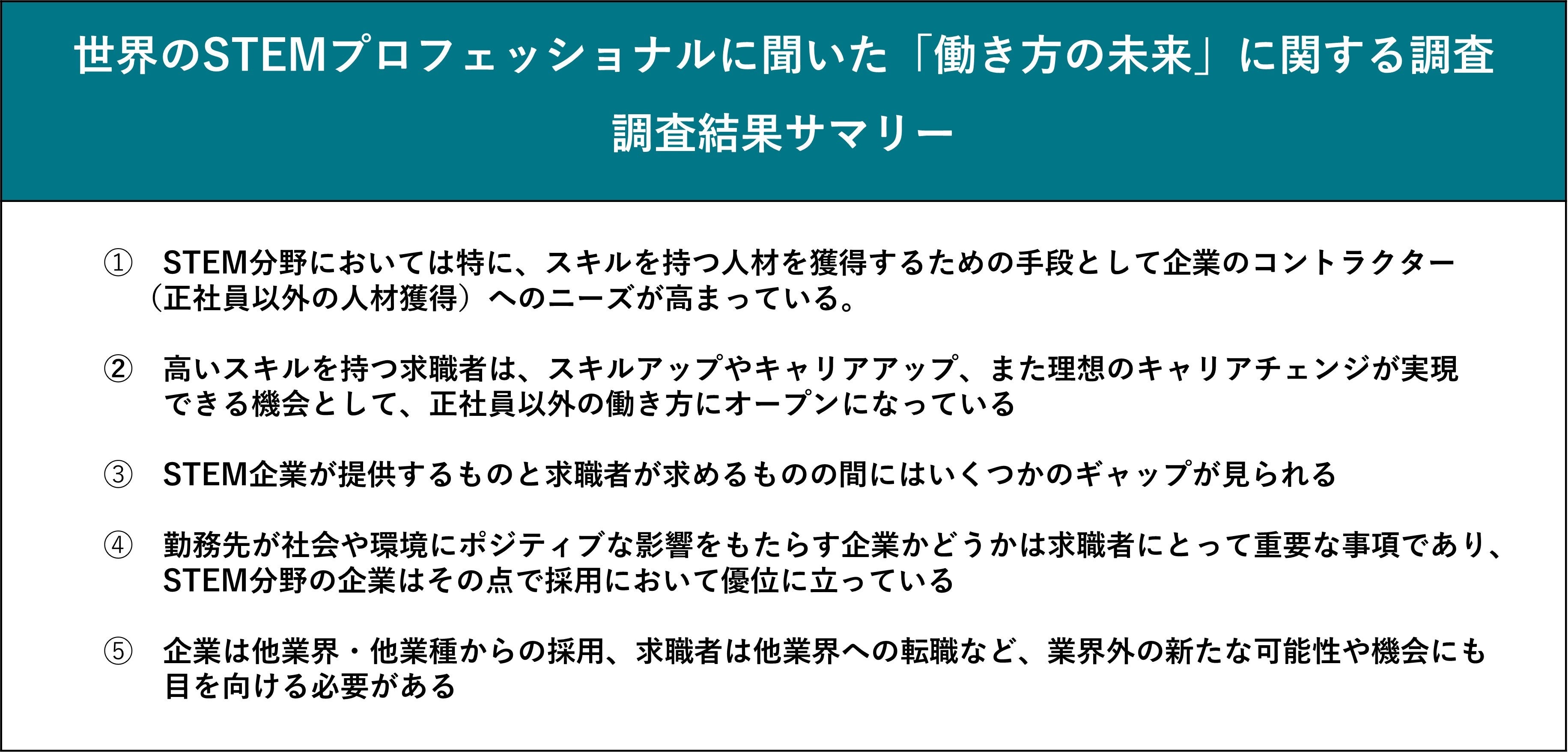 本調査の目的は、欧米諸国と比べて独特な文化をもつ日本市場において、今後多様な働き方へのシフトが見られるのかを明らかにすることです。その調査結果から結論づけられた日本を含む世界共通の大きなトレンドの一つとして、「STEM分野におけるコントラクター*へのニーズの増加」が明らかになりました。