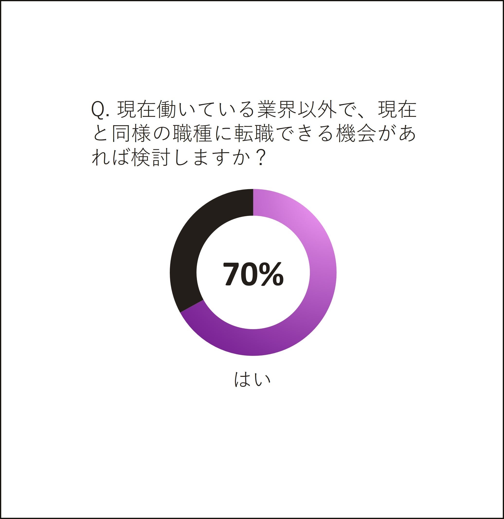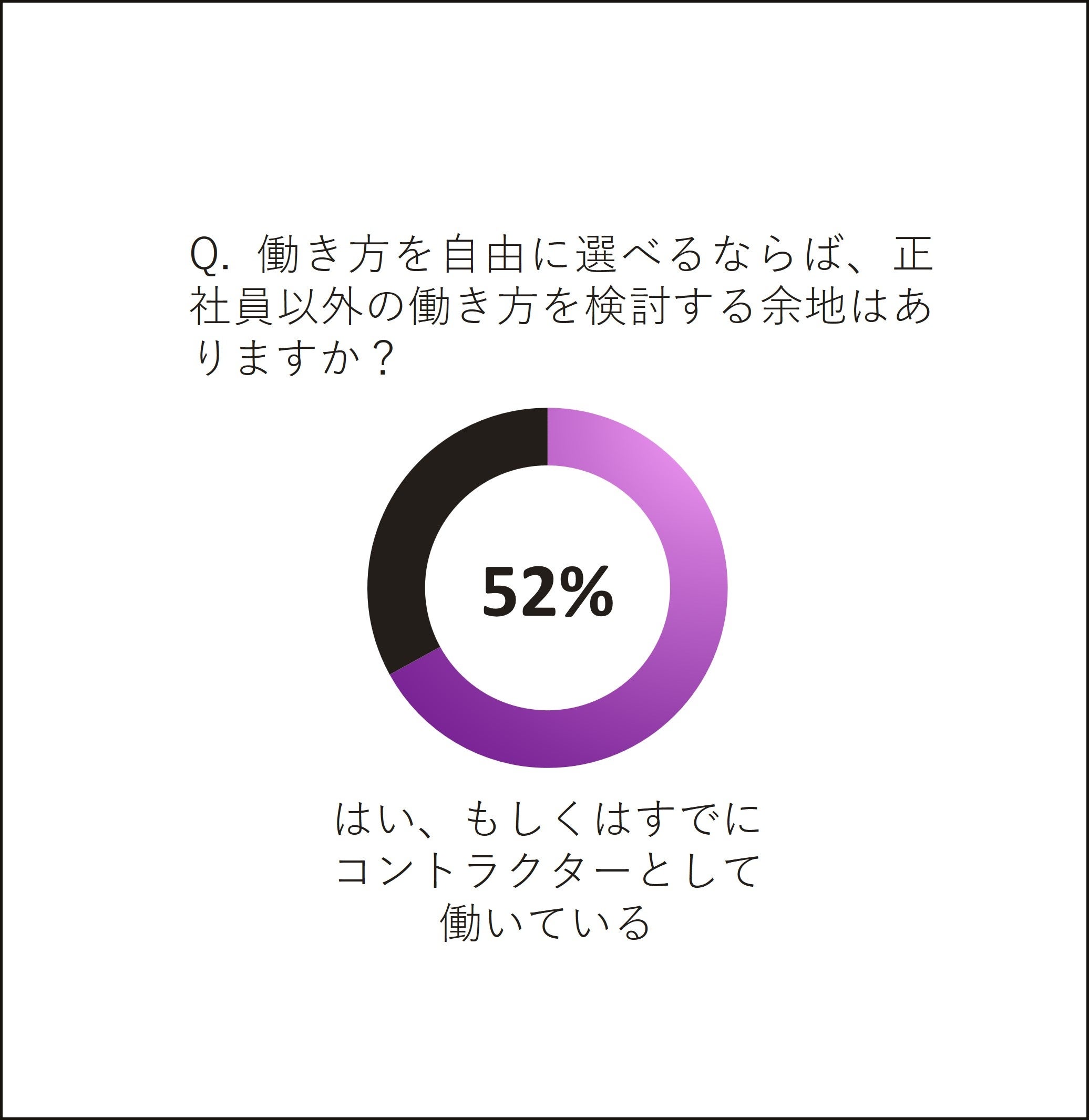 興味深いことに、スキルを持つ求職者の多くが、コントラクトでの仕事をスキルアップや新たな知識を身に着けるための機会として捉えています。この傾向からも、正社員以外の仕事は“低スキル・低収入”と考えられていた以前とは認識が変わってきており、現在ではより多くの機会や大規模なプロジェクトに参加するための機会としてポジティブに捉える人が増えていることがわかります。