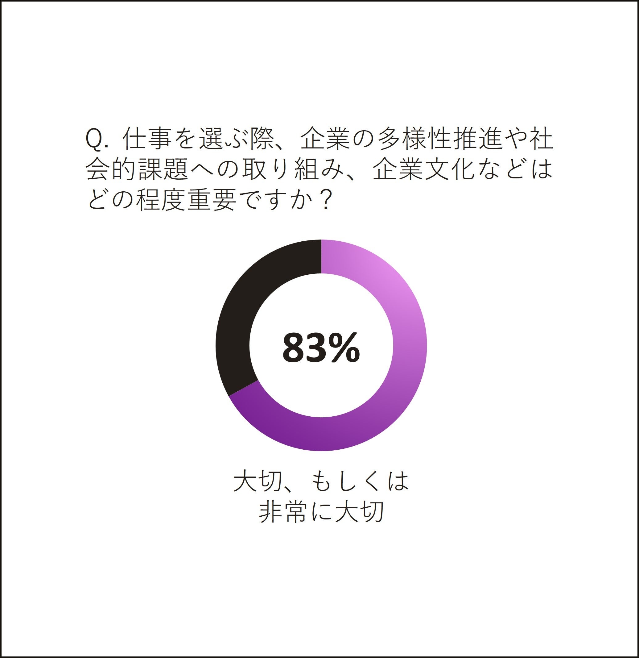 日本では大企業や有名企業で働くことが一種のステータスと認識されてきましたが、近年、ESG(環境、社会、ガバナンス)やSDGsへの意識が非常に高まっており、多くの人が何かしらの形で世界や社会へ貢献することを望んでいます。地球の未来に貢献できる仕事や、それらを実現するビジネスを展開する会社を通じてポジティブな影響を与えたいと考える人が増えているのも、当然の流れと考えられます。これは若い世代において特に顕著に見られる傾向であり、インパクトを生み出すことのできる組織で働くことを望む求職者が増えています。調査の参加者の83%が、働く先の企業を選ぶ際に、企業のESGへの取り組みや多様性推進、企業文化は非常に重要、もしくは重要と回答しています。この傾向はグローバルの調査でも同様の傾向が見られており、「世界に貢献する機会」が一貫して登場しており、STEMスペシャリストにとって優先度の高い項目であることを示しています。このように、高い志を持つスペシャリストを惹きつけるには、企業はESGや多様性推進への取り組みを明確に、そして説得力のある形で発信していく必要があります。