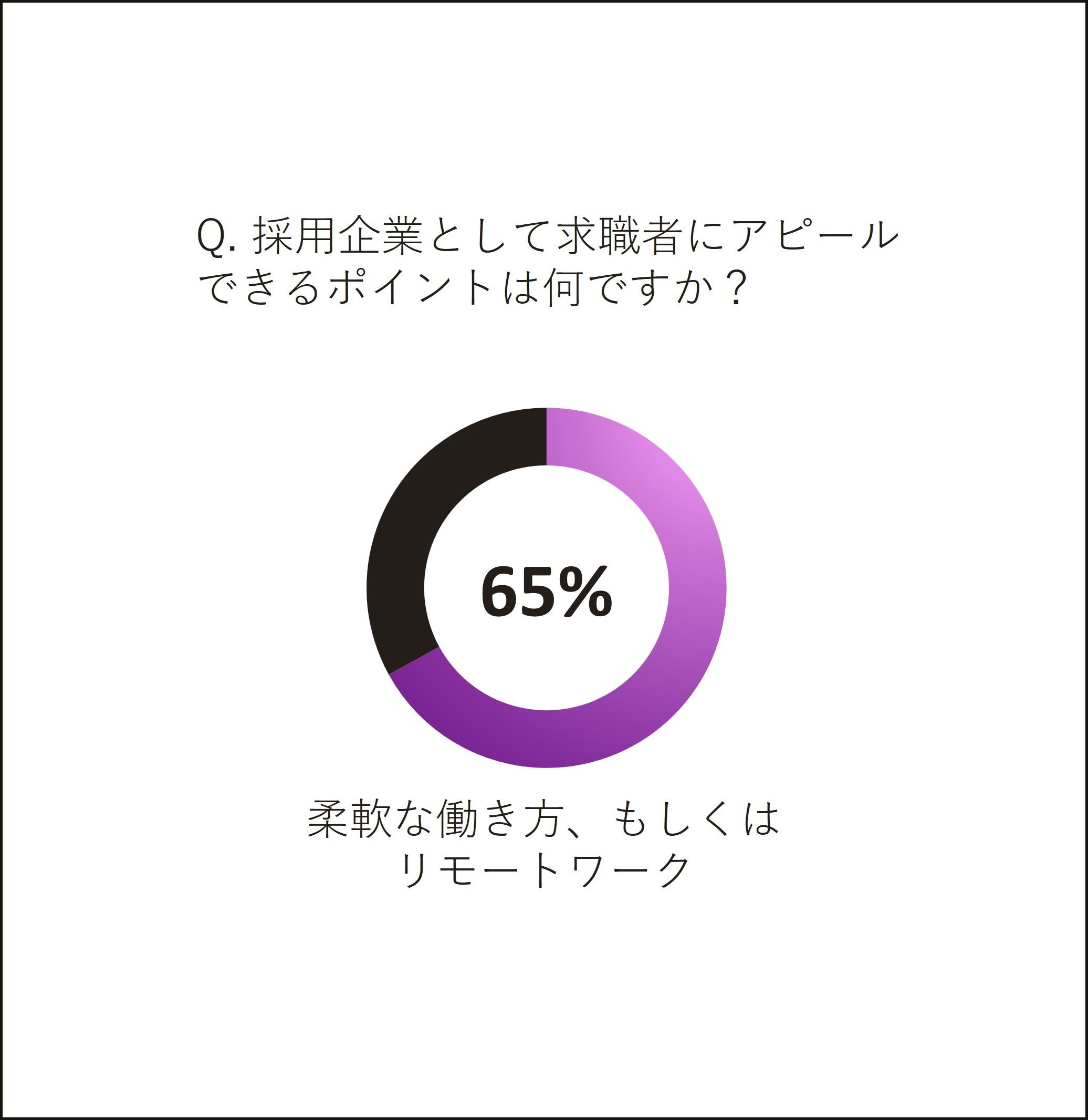 しかし、求職者とSTEM企業の認識にはギャップが見られます。上述のように求職者が柔軟な働き方を当然の権利と考え始めている一方で、調査に参加したSTEM企業の65%が柔軟な働き方やリモートワークを「会社のアピールポイント」であると述べています。2位以降はワークライフバランス、目的、企業文化と続きますが、給与や報酬パッケージ、福利厚生はすべて会社のアピールポイントの下位にランクインしているのは興味深い結果です。