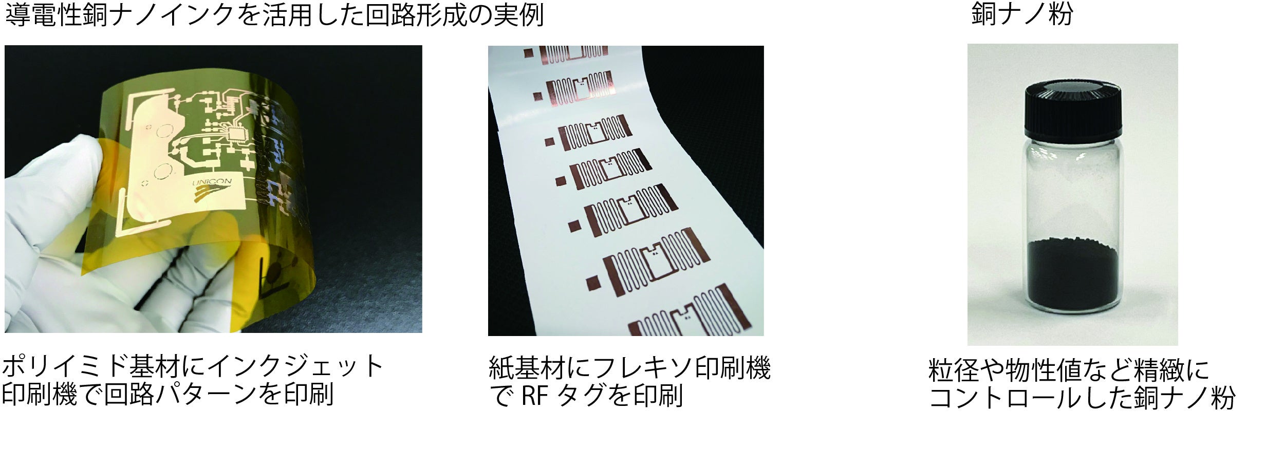 当社では事業分野の一つ「電子関連分野」において、プリンテッドエレクトロニクス用インクとして導電性銅ナノインクの製造に着手しています。この原料の銅ナノ粉は当社独自の技術で、粒度、物性値を正確にコントロールできる画期的な量産方法です。古くから知られる銅の抗菌性能を、ナノ化による表面積増大効果で増強し、速攻性と高い効果を併せ持つ、優れた抗菌抗ウイルス剤の開発に成功しました。