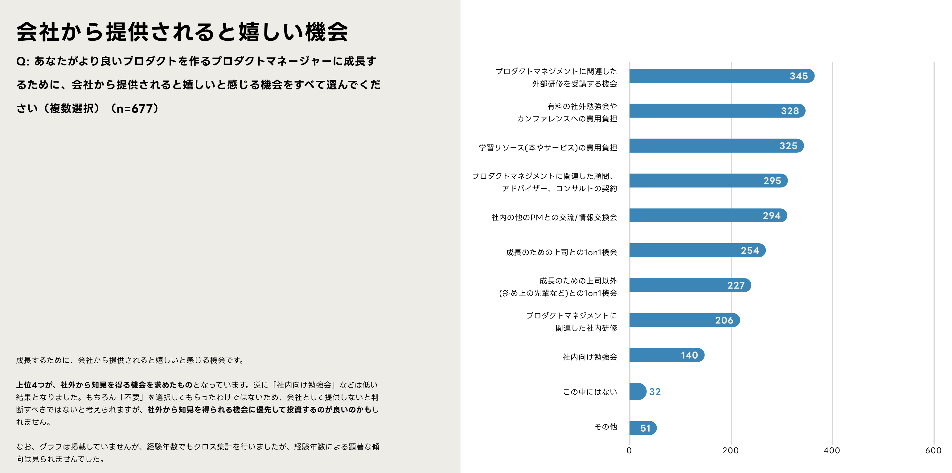 「日本で働くプロダクトマネージャー大規模調査レポート 2022 by pmconf」によると、プロダクトマネージャーの多くが「社外で学ぶ機会がない」と回答しています。