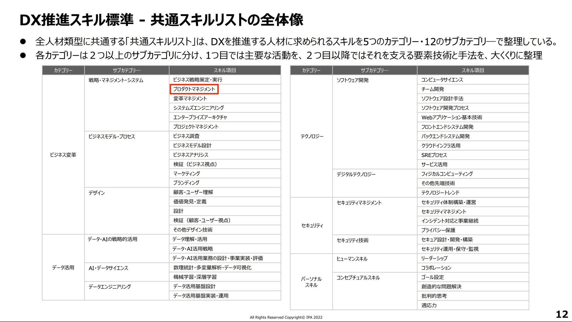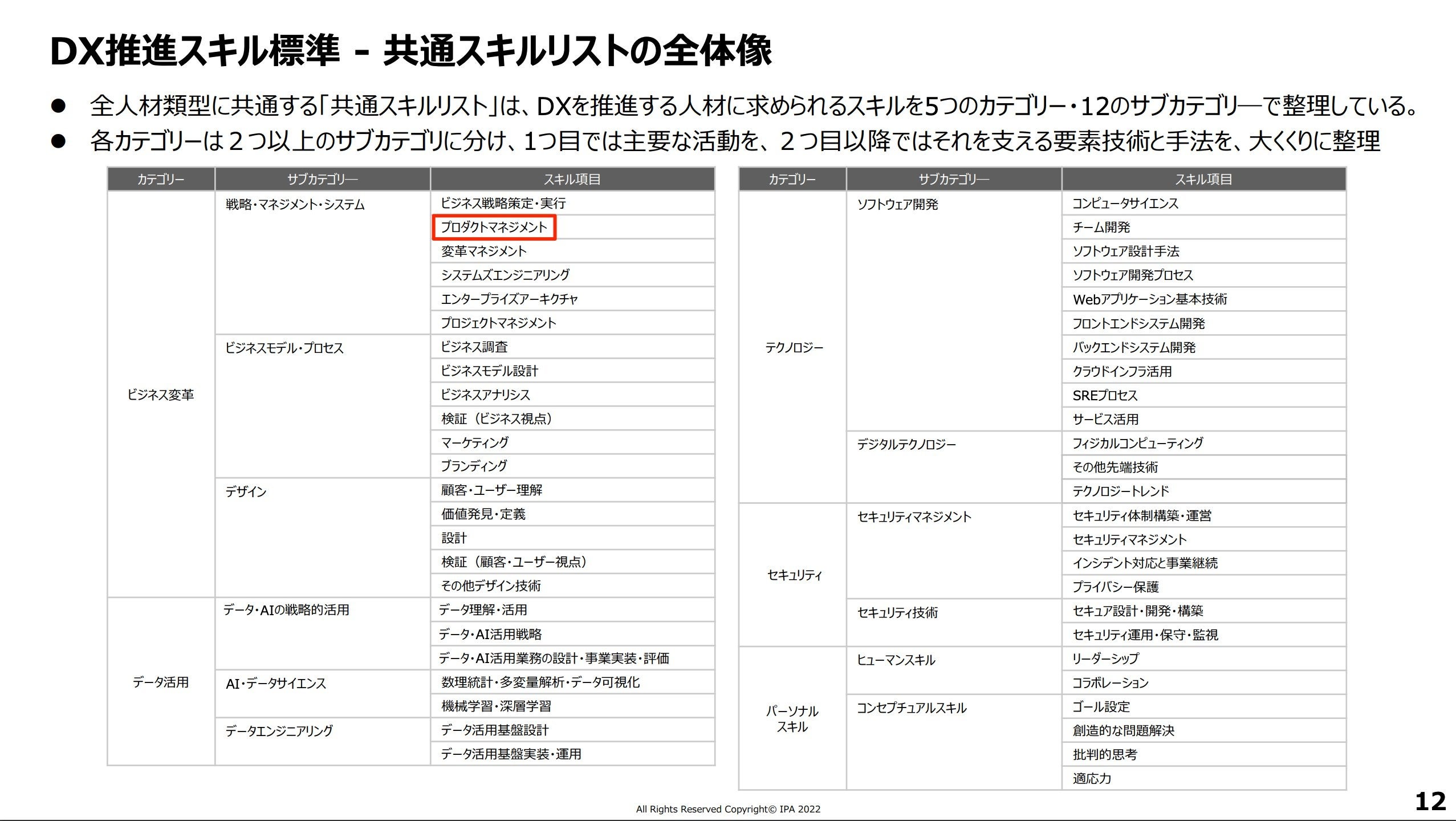 経済産業省が公開したDXを推進する人材の役割や習得すべきスキルを定義した「DX推進スキル標準(DSS-P)」にて「プロダクトマネジメント」の職能が明記され、今後ますます市場価値が高まることが予想されます。