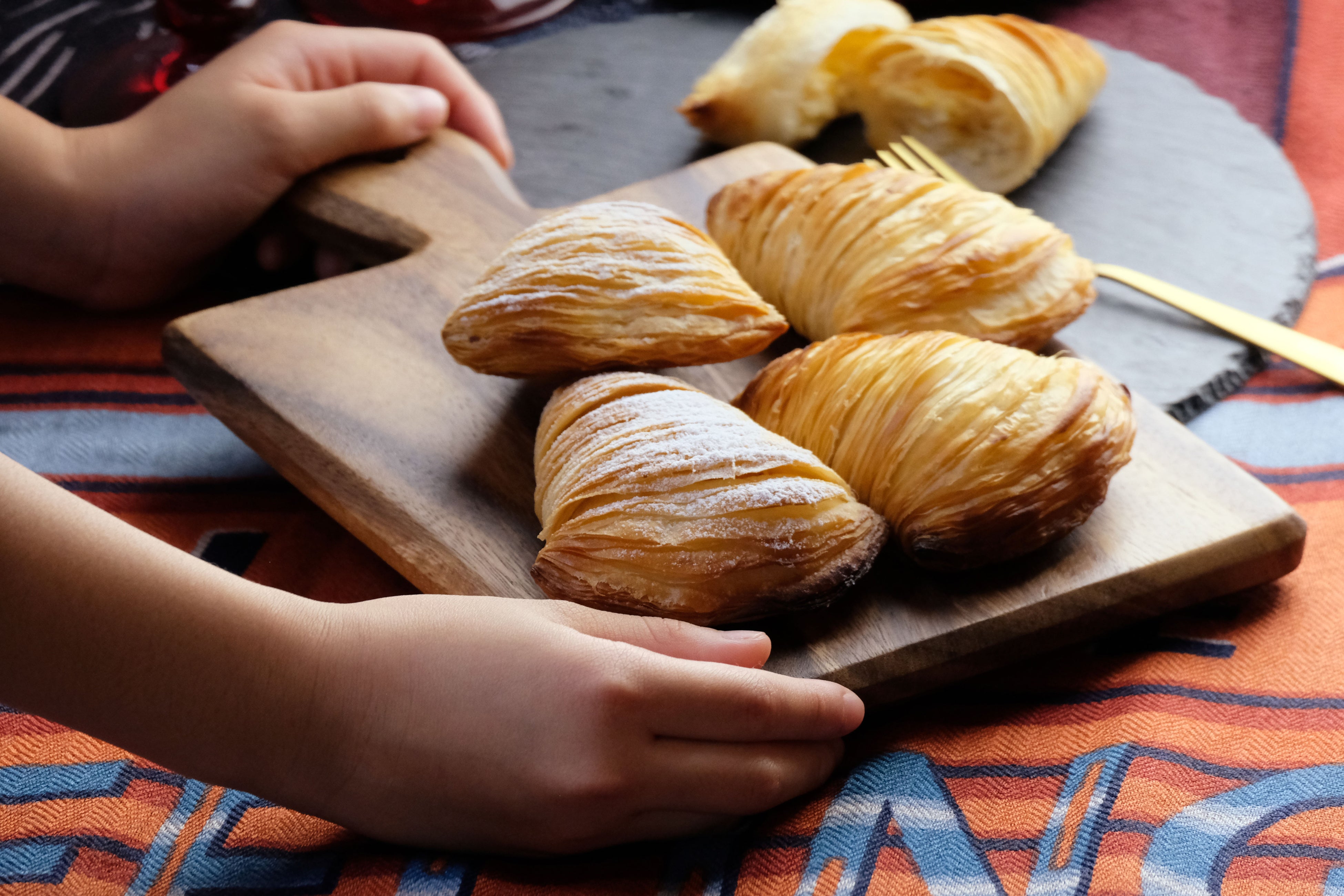 スフォリアテッラとは、イタリア南部カンパニア州ナポリの名物焼き菓子です。イタリア語で「ひだを何枚も重ねた」という意味があり、薄く何層も重ねた貝殻形状のパイ生地の中に、リコッタチーズクリームなどのクリームを入れ、オーブンで焼き上げます。バターではなくラードを使用しているため、クロワッサンのようなサクサク食感ではなく、新感覚のパリパリ食感が特徴です。