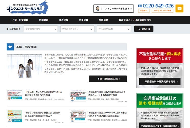 「弁護士法人QUEST法律事務所が運営する法律ポータルサイト、クエストリーガルラボの男女不倫問題(慰謝料請求・慰謝料被請求・離婚)に関するPV数が167万件・ユーザー数135万人を突破!」