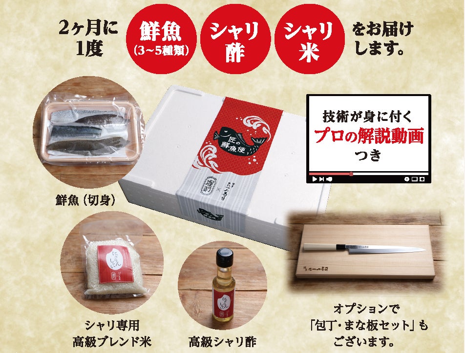 季節の鮮魚(切り身、3〜5種類)、シャリ専用米、シャリ酢、レシピ