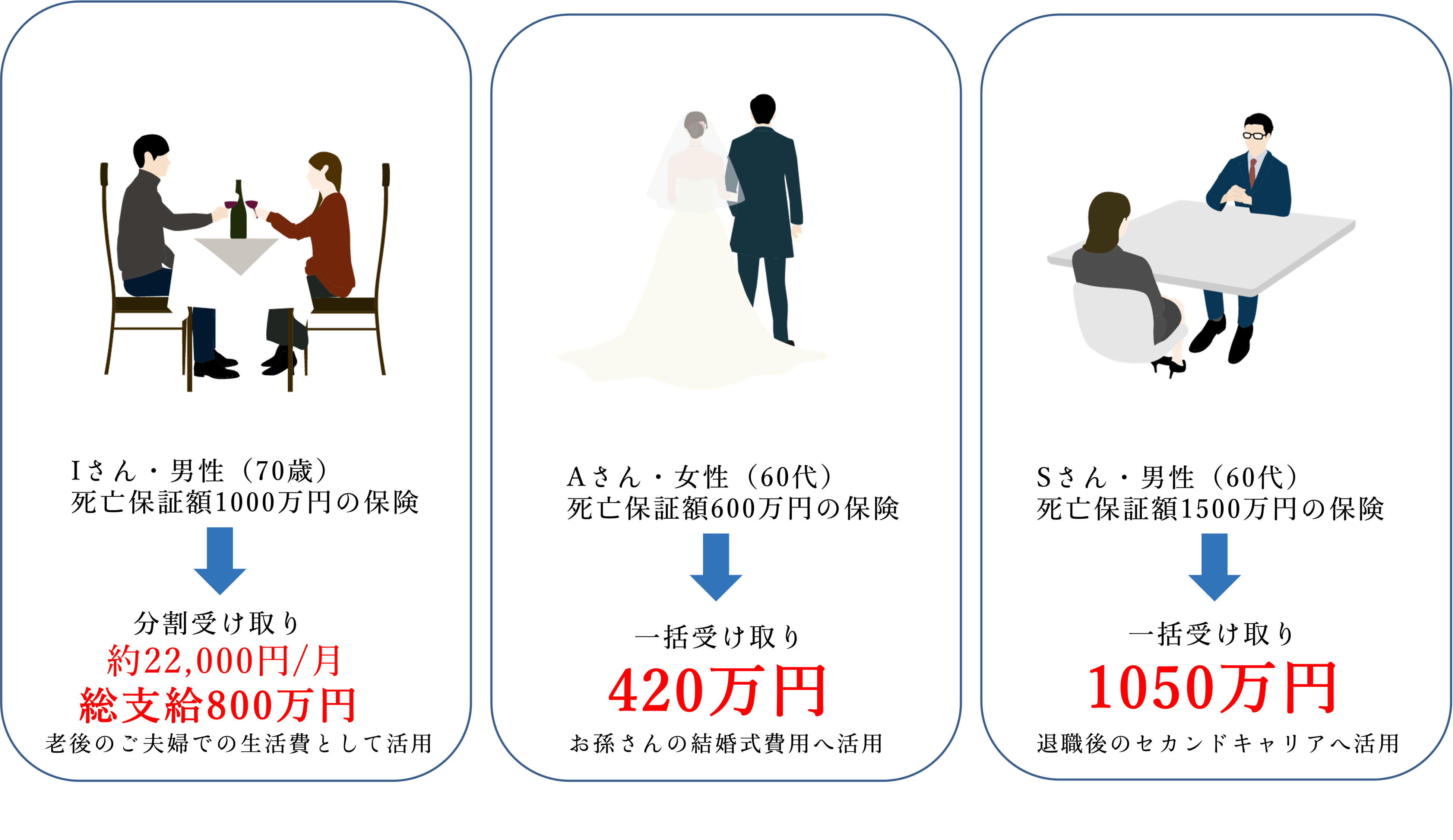 | 特 徴 | ・従来、解約・死亡時にしか受け取ることのできなかった支払済終身保険を生前から現金に変えることができ、契約者自身が生命保険を活用することができる ・買取金の支払いは、買取完了後から100歳まで続くため、ご契約者様が途中で亡くなったとしてもご家族が引き続き買取金を受けることができる |