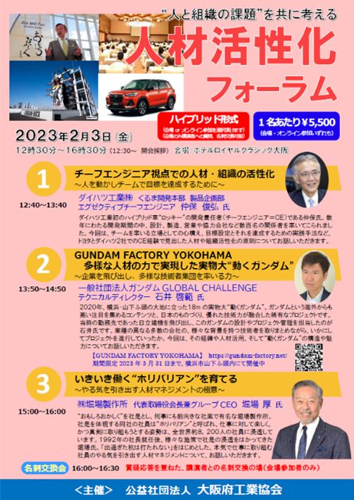 中小企業を中心に人づくりと企業間交流を推進する公益社団法人大阪府工業協会(大阪市中央区南本町2-6-12、会長:黒田章裕・コクヨ株式会社会長)は、人と組織の課題をテーマにした講演会「人材活性化フォーラム」を2月3日(金)に開催します。ものづくり関連団体ならではの切り口で、他では揃わない3名の講演者を選定。「人材」を軸にした、ここでしか聴けない講演を通じて、自社における人材活性化のヒントを得ていただける場です。