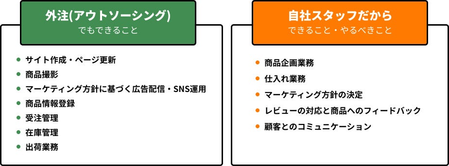 数字として見えにくい様々なコストが発生するEC事業は「(少人数・低コストで)始めやすい分、(スタートと同じ体制のままでは)伸ばしにくい」という性質もあります。これが「とりあえずECやってるけど、ずっと売上が伸びないまま」という状態の会社が多い理由の一つではないでしょうか。そんなときは自社スタッフだからできること・やるべきことと外注(アウトソーシング)でもできることを分けて考えてみると良いでしょう。