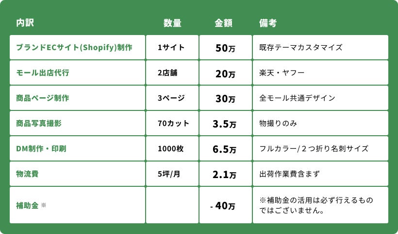 | ブランドECサイト(Shopify)制作 | 1サイト | 50万円 | 既存テーマカスタマイズ |