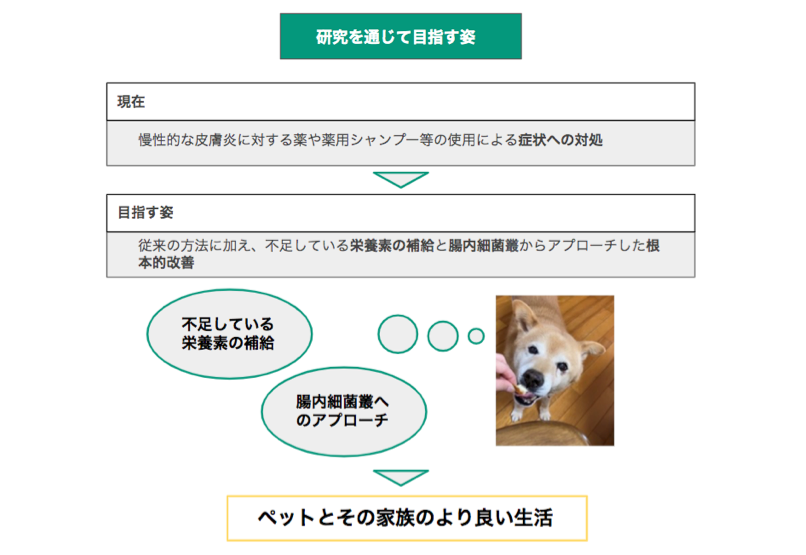Total Animal Medi株式会社と、宮崎大学農学部金子泰之准教授は、犬の皮膚被毛の剥落、表皮の弱化、痒みを脂肪酸を含む栄養素の投与や腸内細菌叢へのアプローチによって改善させることを目的とした研究を行なっています。【研究の背景】