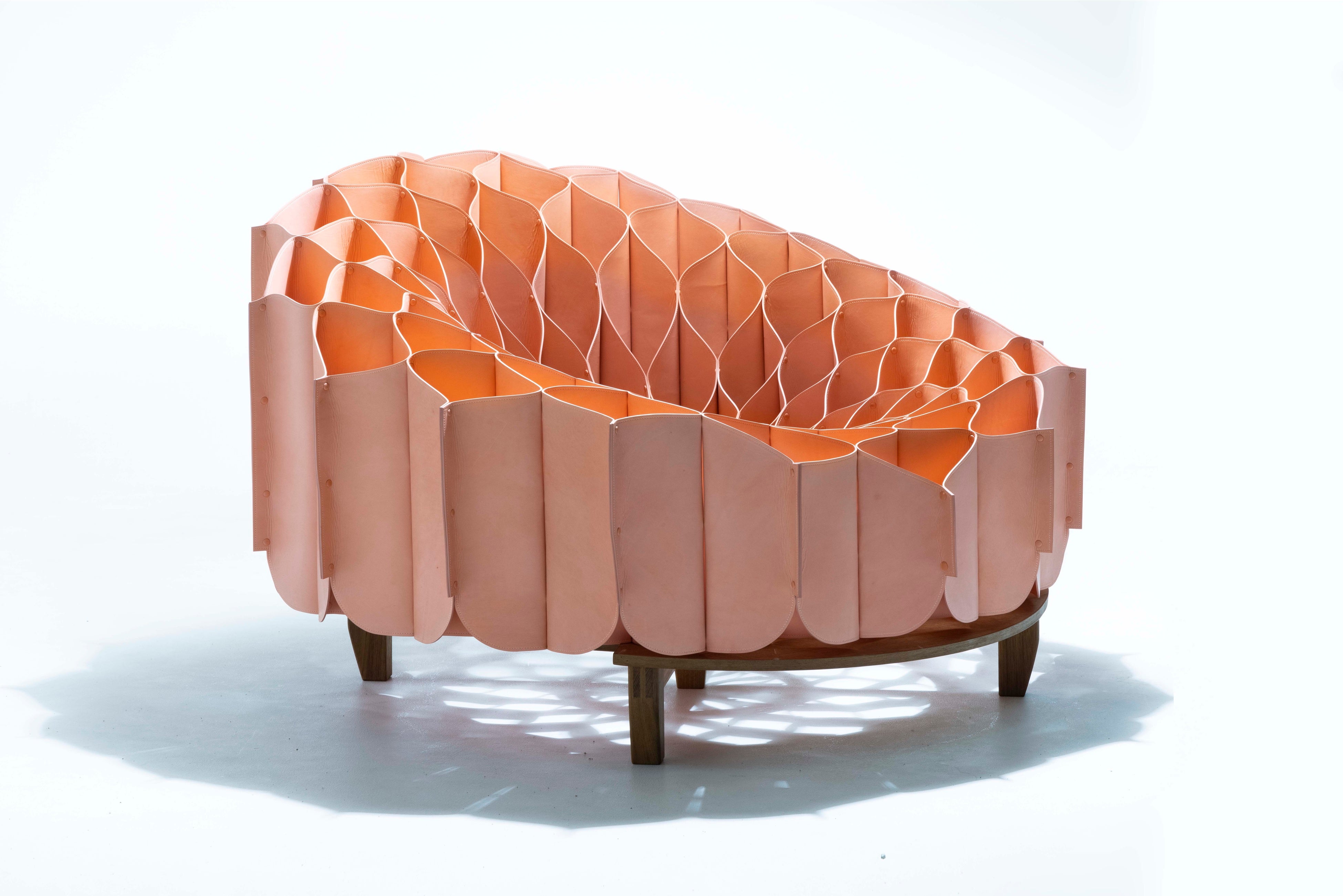 2021年10月発表の、世界的若手建築家ジョニー・チウがデザインした神戸レザーを使った新しいコンセプトのアウトドアチェア「“BLOOM” by Johnny Chiu & KOBE LEATHER」が、2022年12月に台湾のデザインアワードであるゴールデンピンを受賞。デザインコンセプトは「野に咲く花」であり、どのような場所であってもそこから快適な着地点を探し、根付き、花を咲かせる自然の営みを、「円」のデザインで表現。この表現と「食べるだけで終わりではなく、生き物の恵みを活かすこと」をコンセプトとした神戸レザーとが見事に調和した斬新な椅子となっています。