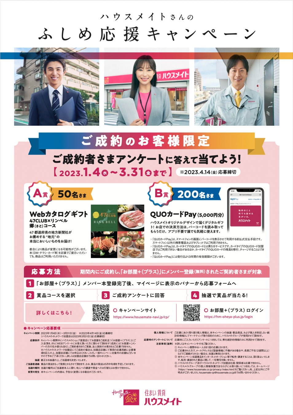 参加条件:キャンペーン期間内に、ハウスメイトショップ仲介店舗でご成約且つ「お部屋+(プラス)」に入会されたお客様、またはハウスメイトネットワーク加盟店にてお部屋をご成約されたお客様。
