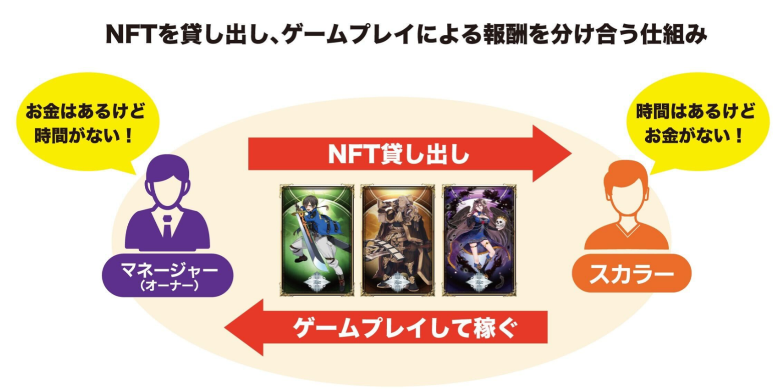 NFTを保有している人(オーナー)が、NFTを借りたい人(スカラー)に対し、NFTを貸し出し、スカラーがNFTを使ったゲームプレイによって獲得した報酬を分け合う制度。