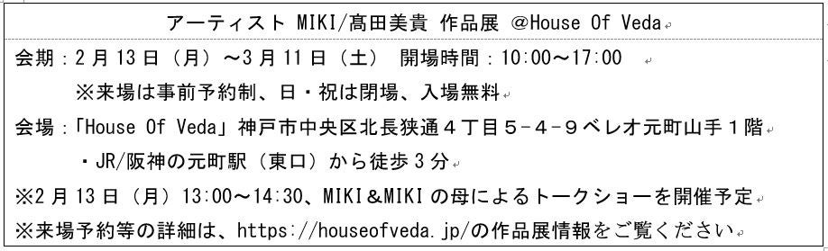 【アーティスト MIKI/髙田美貴 作品展 @House Of Veda】