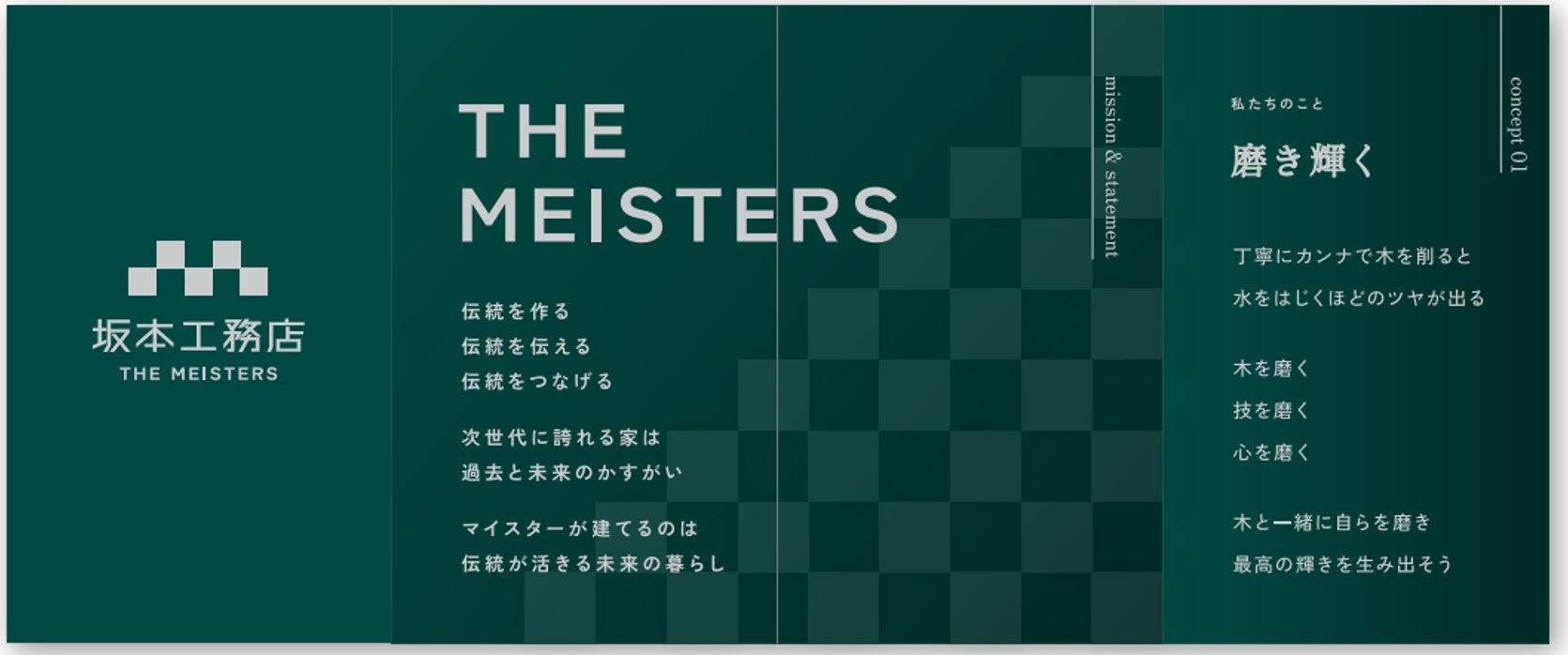 ロゴデザインもシンプルで和モダンなロゴデザインに一新。市松模様のようなシンボルマークは、マイスターズの頭文字「M」。市松模様はその柄が途切れることなく続いて行くことから、繁栄の意味が込められています。マイスターの緻密で洗練された手仕事、その技術力も途切れることがなく続くよう願いを込めました。名刺・封筒など各種ツールも一新いたします。