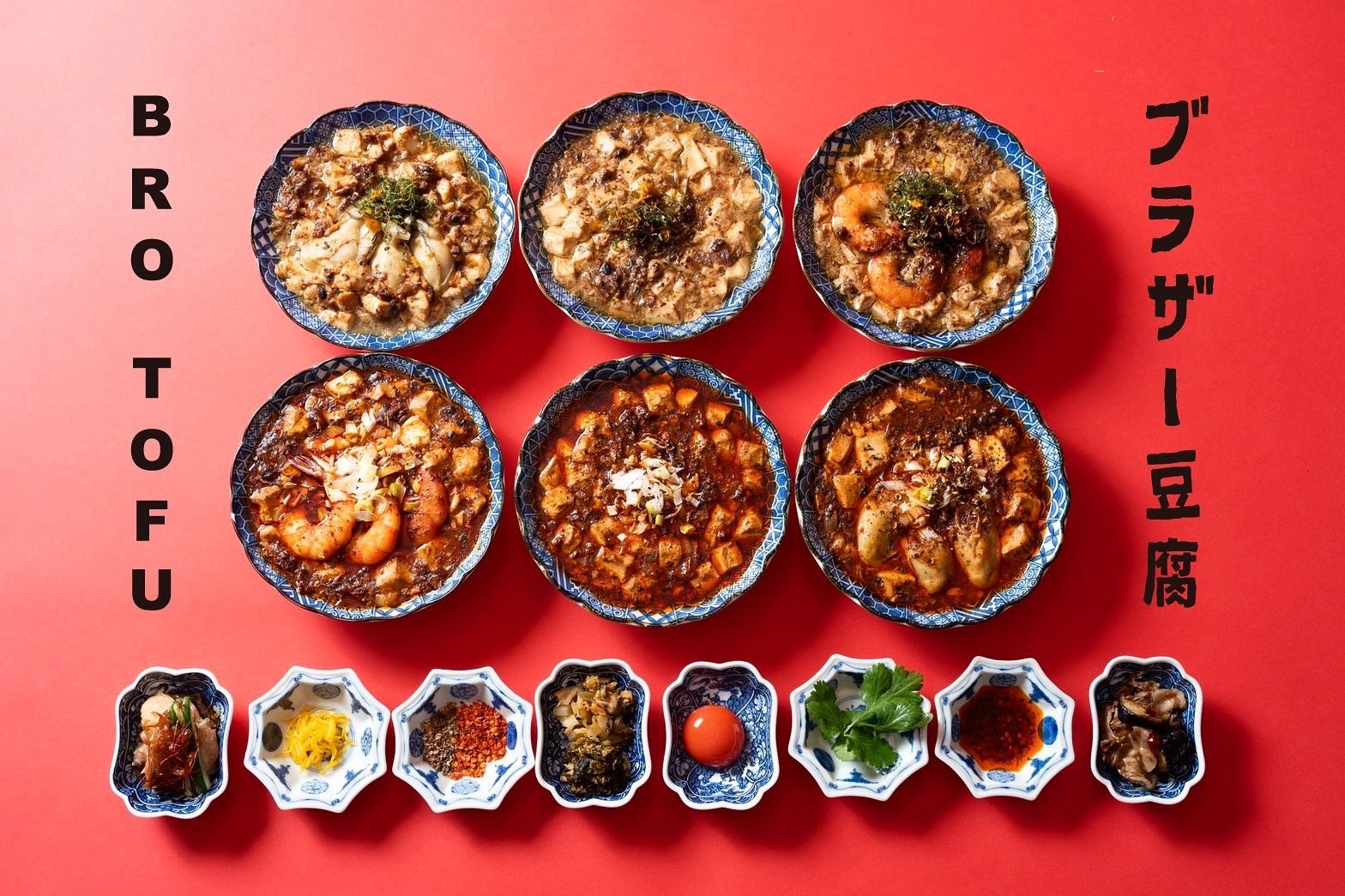ブラザー豆腐™の名物は、自慢の京豆腐、秘伝の辣油、自家製の醬(ジャン)が織りなす本格四川風麻婆豆腐です。麻婆豆腐を楽しむために開発された8種の薬味をお好みでトッピングでき、アツアツご飯と合わせてお召しあがりください。