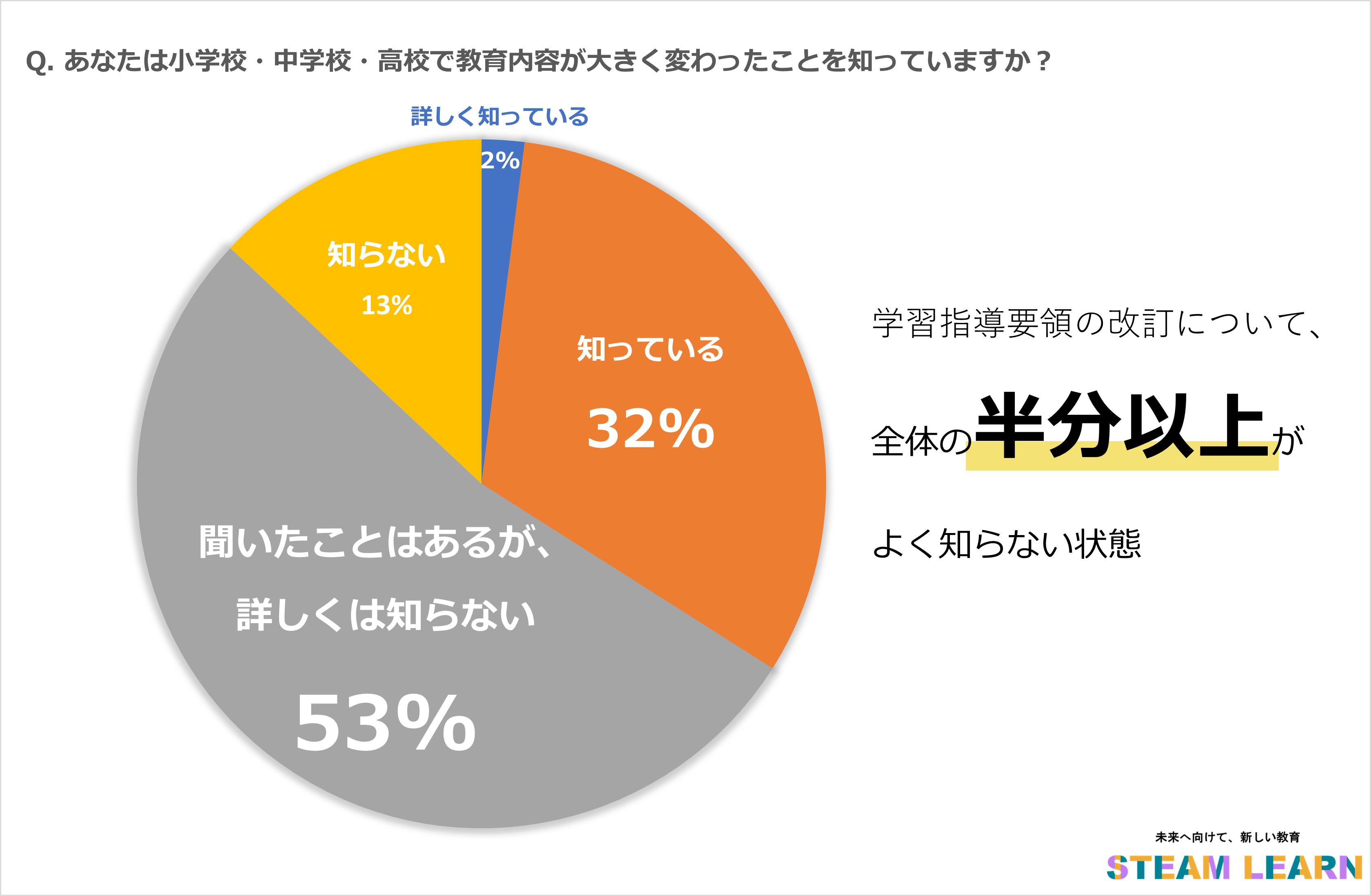 つまり、子どもを持つ親世代でも半数以上が新学習指導要領の内容を良く知らないという結果でした。