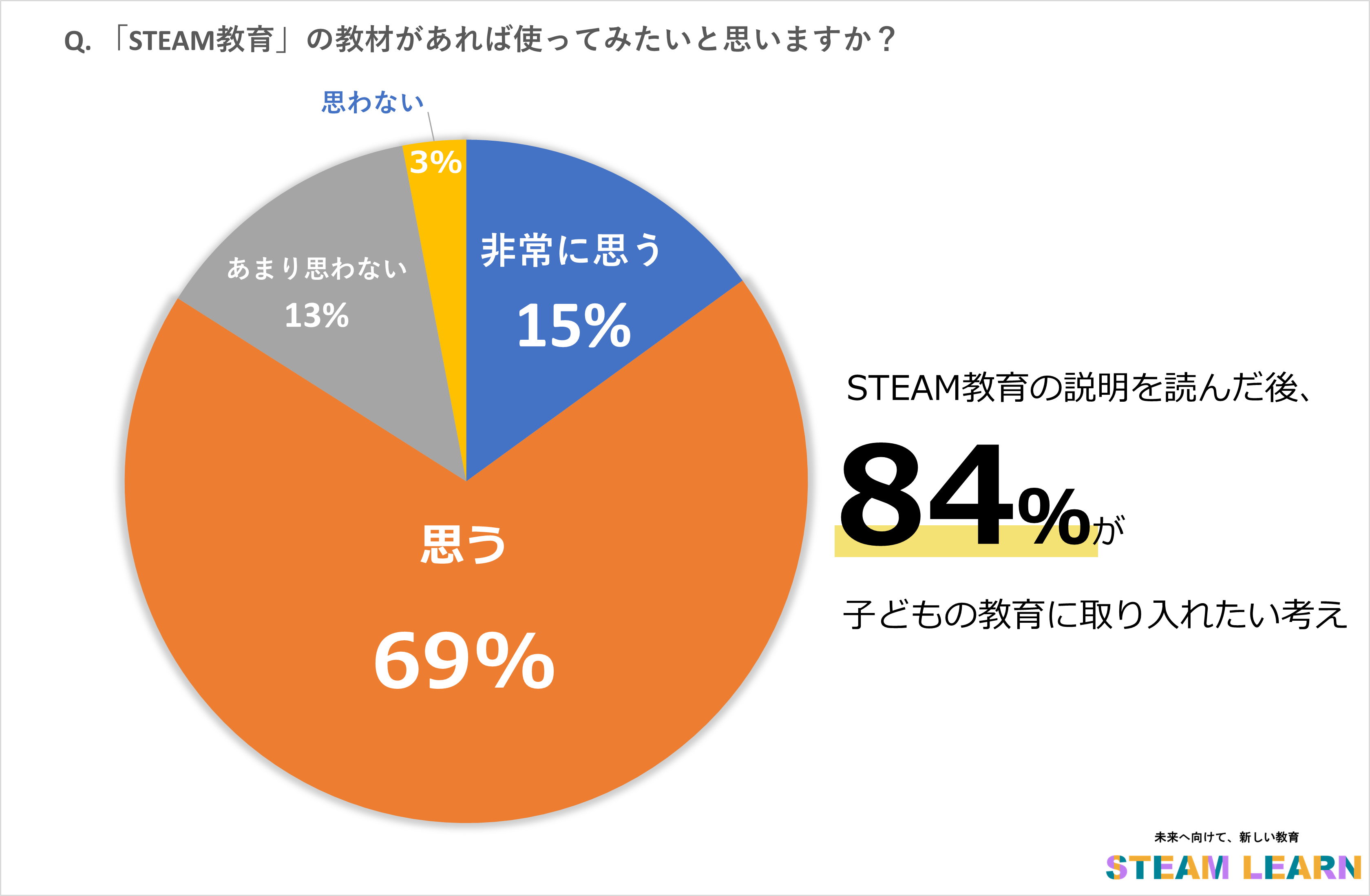 したがって、全体の84%が子どもの教育にSTEAM教育を取り入れたいという考えを持っていることがわかりました。