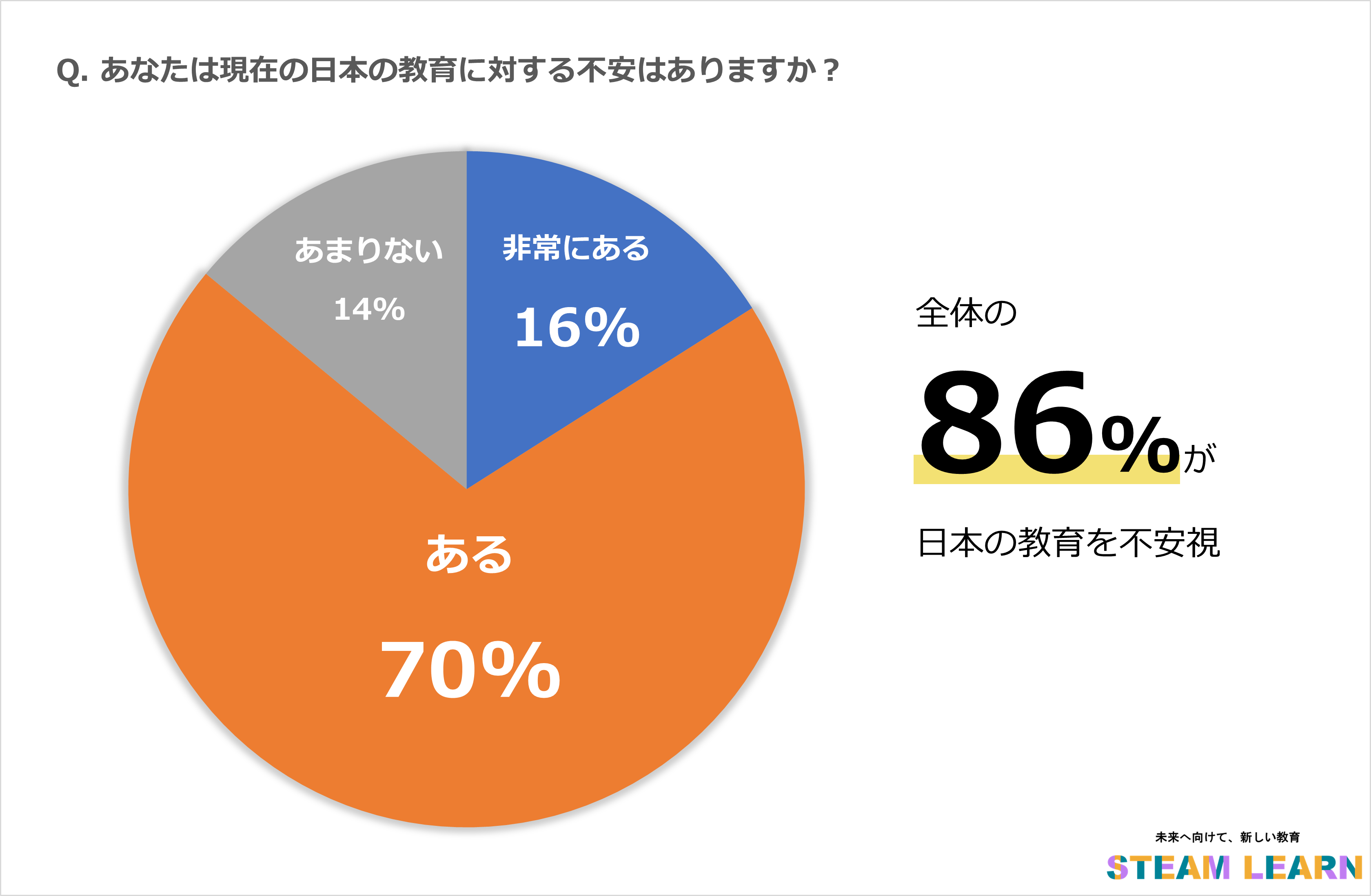 アンケート結果では、子どもを持つ親世代の86%が、現在の日本の教育を不安に思っていることがわかりました。
